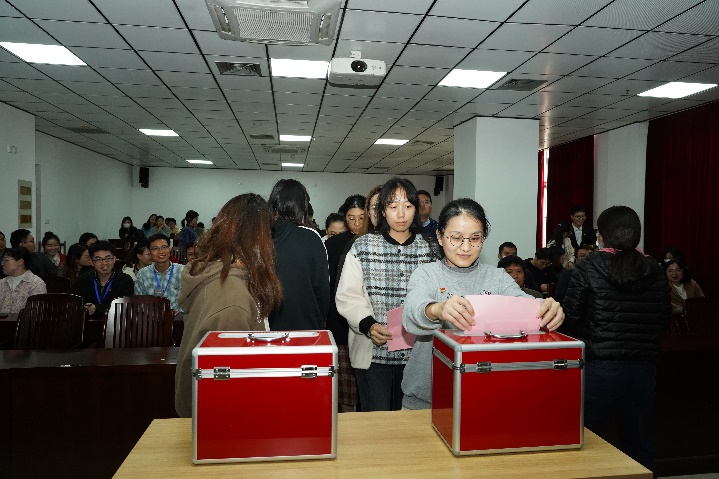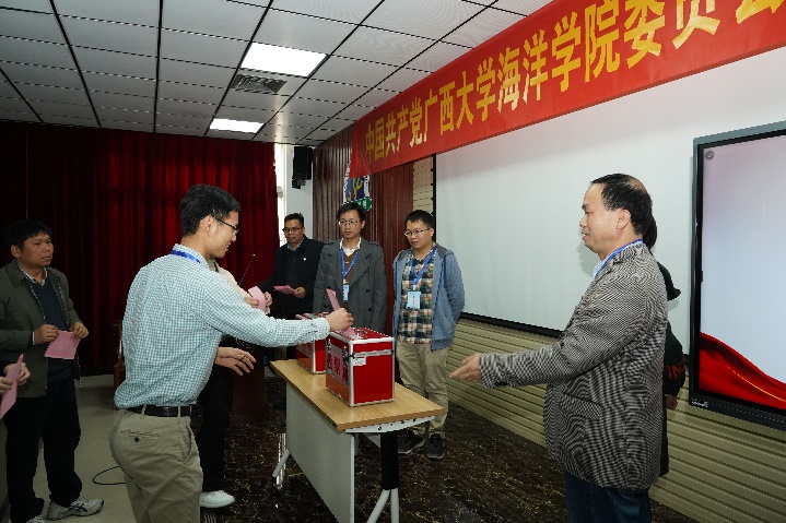 本次大会应到有选举权的正式党员67名,因病、因事请假3名,实到会正式党员64名,符合规定人数。大会先以举手表决的方式通过了《大会选举办法》和总监票人、监票人名单,然后酝酿讨论并通过了海洋学院党委委员、纪委委员候选人名单,最后以无记名投票方式差额选举产生了新一届海洋学院党委委员和纪委委员。党委委员分别是朱迅成、林玉华(女,瑶族)、姜伟、梁甲元、谭运阳;纪委委员分别是王瑞、朱迅成、周剑。
