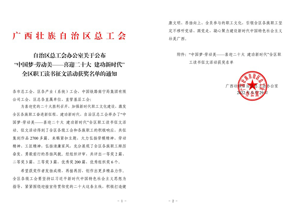 为喜迎党的二十大胜利召开,加强新时代职工文化建设,激发全区各族职工奋进新征程、建功新时代,自治区总工会举办了“中国梦·劳动美——喜迎二十大 建功新时代”全区职工读书征文活动。征文活动得到了全区各级工会和各族职工的积极响应,共征集到作品 2700 多篇。参赛作品紧扣主题,大力弘扬劳模精神、劳动精神、工匠精神,弘扬清廉家风,充分展现了全区各族职工踔厉奋发、勇毅前行的昂扬风貌。经组织评审,共评出一等奖 2 篇、二等奖 3 篇、三等奖 3 篇,优秀奖 200 篇,优秀组织奖 6 个。