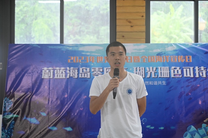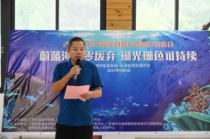 6月8日上午,以“蔚蓝海岛零废弃 瑚光珊色可持续”为主题的2023年“世界海洋日暨全国海洋宣传日”主题活动在广西大学海洋学院涠洲岛珊瑚馆举办。本次活动由广西大学海洋学院、北海市涠洲岛旅游区管理委员会、北海市海洋局主办。广西大学海洋学院涠洲岛珊瑚馆、北海民间志愿者协会、广西涠洲岛珊瑚礁国家级海洋公园管理站、涠洲生态旅游法庭、涠洲镇人民政府、涠洲岛南湾海上运动中心联合承办。活动还得到了北海市公安局涠洲岛分局、涠洲镇渔牧站、北海市涠洲岛新绎海洋运动有限公司、北海探索潜水运动基地有限公司、深呼吸潜水运动有限公司、涠洲岛民宿客栈与精品酒店协会等支持。