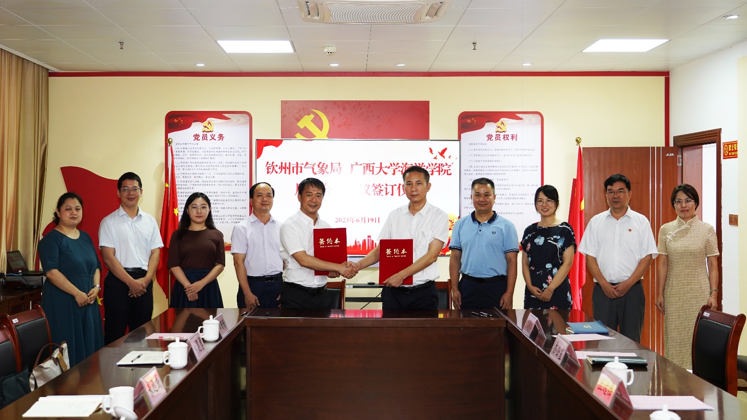 6月19日,广西大学海洋学院党委副书记朱迅成率队到钦州市气象局开展海洋气象教学科研暨人才培养深度融合联培联建活动,开展“访企拓岗”,并举行“广西大学海洋学院 – 钦州市气象局校外实践教学基地”协议签订仪式暨基地揭牌仪式。