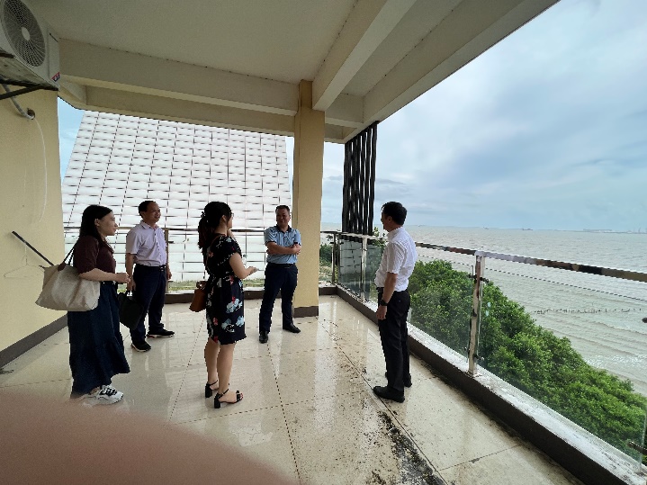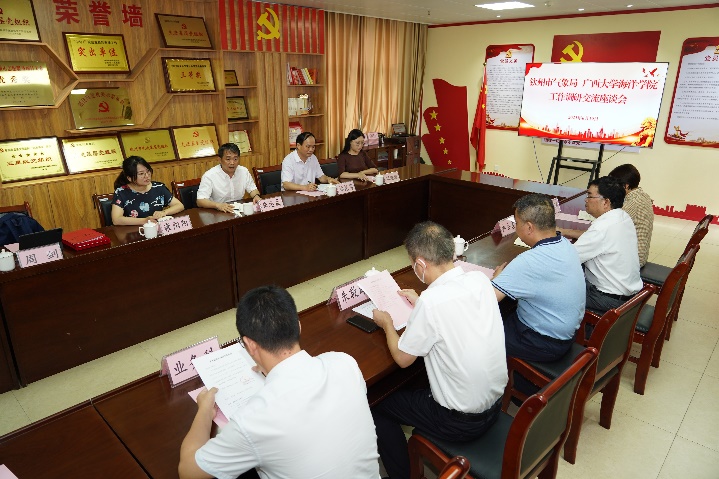 钦州市气象局办公室主任赖玉坤、业务科科长黎时迪、人事教育科科长施佩宏、钦州市气象台工程师潘静,海洋学院林昆勇副教授、物理海洋教研室副主任雍阳阳、助理教授邓珊珊、办公室副主任周剑等一同参加仪式并考察交流。