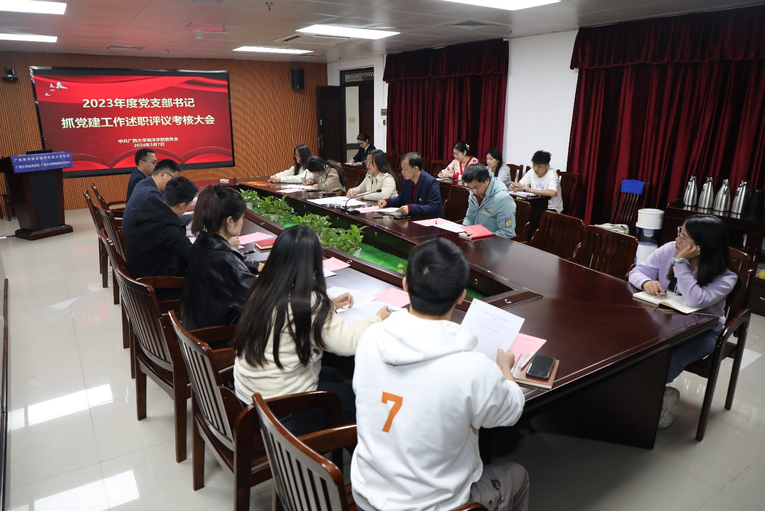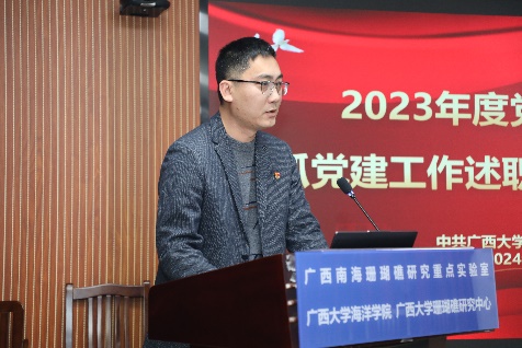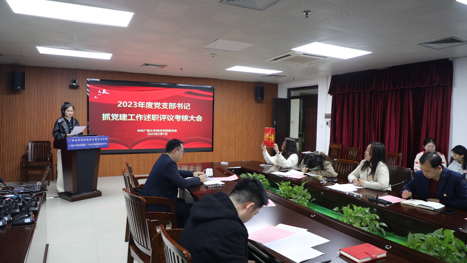 3月7日,海洋学院党委在综合楼1104会议室召开2023年度党支部书记抓党建述职评议工作大会,学院党委领导班子成员、各党支部书记、部分师生代表等参加会议。会议由学院党委书记秦华东主持。