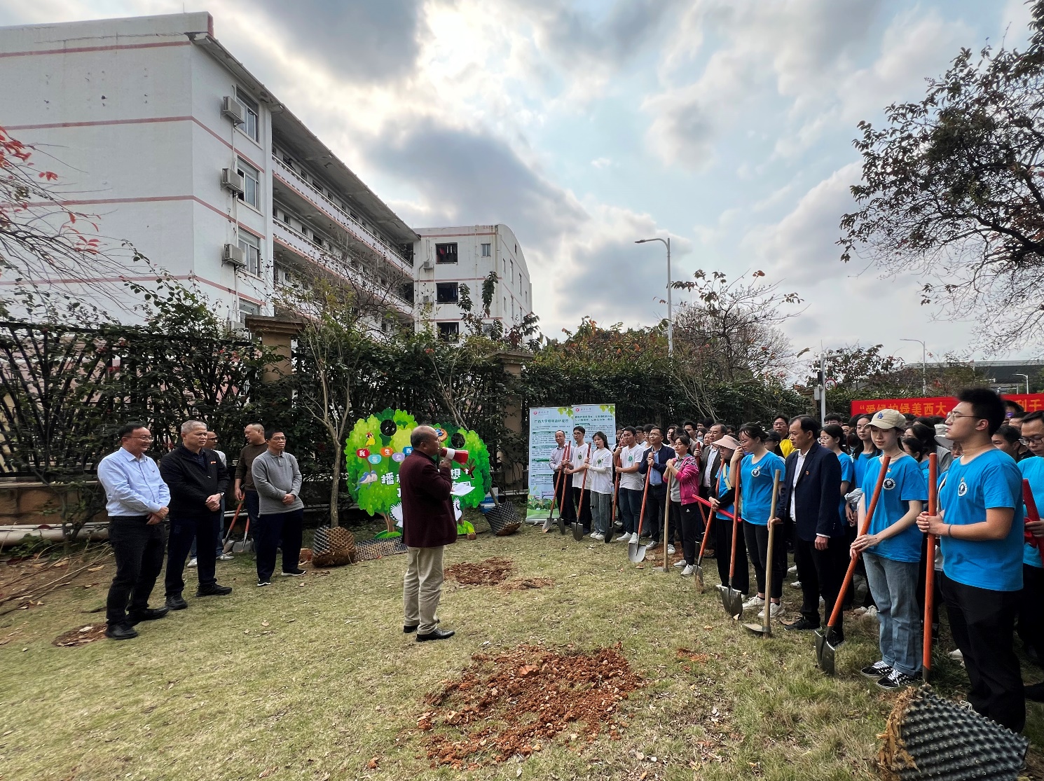 植树现场春意盎然,学校后勤基建处副处长农汉发首先向大家宣讲了植树方面的政策,介绍了学校数年来在植树绿化方面开展的多项工作及取得的丰硕成果,并向大家说明了本次植树活动基本内容。接着,学校后勤基建处园林绿化技术岗负责人卢广昌向大家详细介绍了树苗栽种的规范流程及注意事项,并部署了各单位的任务分工。最后,在学校党委常委、副校长宁旭初的宣布下,本次植树活动正式拉开帷幕。
