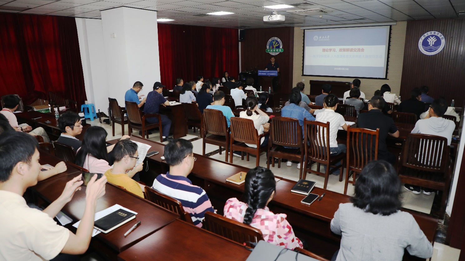 人力资源处党支部侯莉、蔡凌波、韦金萍、王峰四位同志分别为大家解读了涉及教职工切身利益的《广西大学师德考核办法》《广西大学教职工请假销假管理办法》《广西大学博士后管理办法》《广西大学岗位等级(职级)评定管理办法》等文件,并与老师们进行了积极有效的交流。