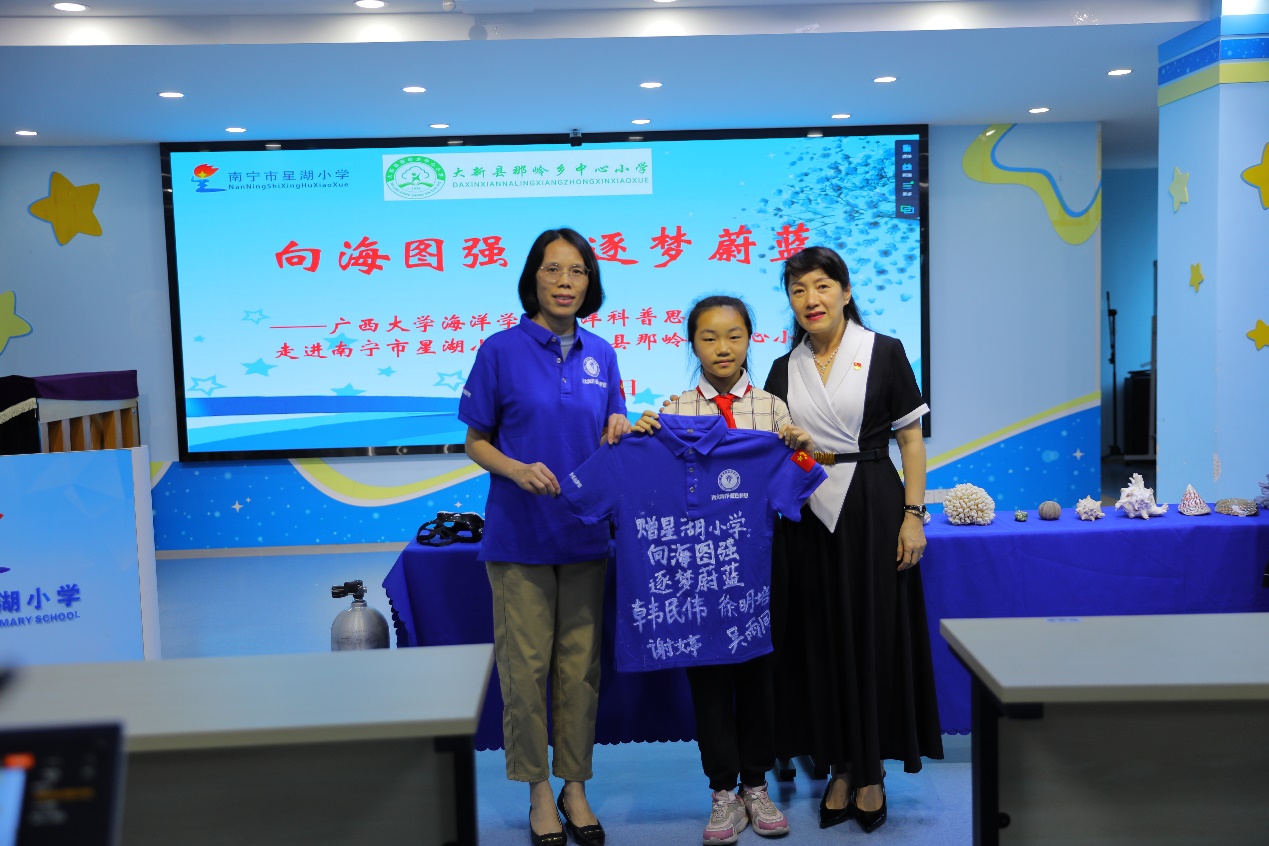 学院副院长刘旗扬向星湖小学赠送了一件有学院“蓝色梦想”科考团队成员签名的服,勉励星湖小学的孩子们探索海洋、逐梦蔚蓝。星湖小学党总支书记李若梅回赠海洋学院“星娃吉祥物”。校长邓颖涛、副校长杨谦、广西大学海洋科教馆常务副馆长李周佳、广西大学海洋学院科普思政课团队成员、星湖小学、大新县那岭乡中心小学300多名师生参加活动