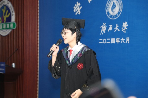 2024届本科毕业生臧声林同学在发言中,用真挚的情感回顾了四年的大学生活。她讲述自己从迷茫到坚定、从挣扎到成长的转变过程,对舍友、朋友、导师和授课老师的陪伴与支持表达深深的感激。她鼓励同学们珍惜当下,以积极的心态迎接未来,并祝愿海洋学院和同学们前程似锦。