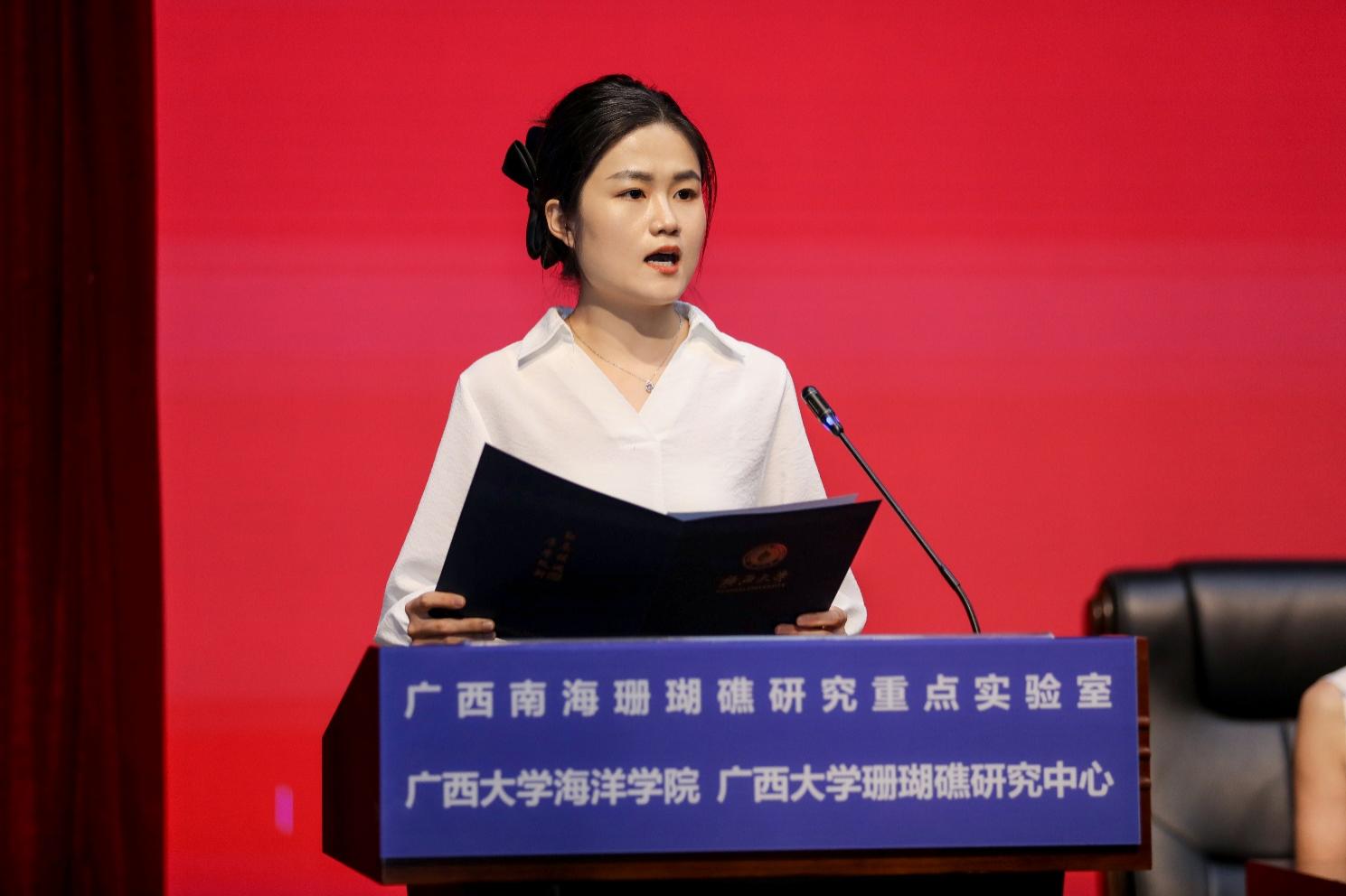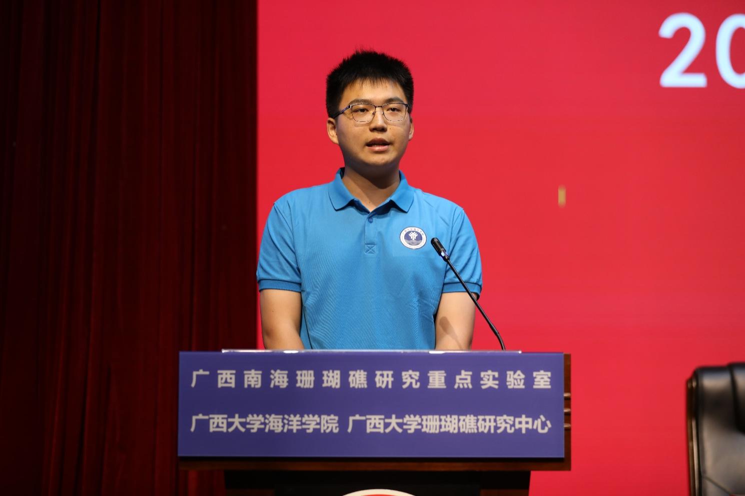 研究生新生代表2024级1班袁欣萌同学作了题为《凝聚深蓝情,共筑珊海梦》的发言。她首先向老师们致以崇高的敬意,并表达了对即将深入探索海洋科学的激动与期待。她说到,海洋不仅是生命的摇篮,更是人类知识与技术的宝库,作为研究生,他们肩负着探索未知、揭示真理的重任。她提到,珊瑚礁是他们研究的重要对象,其多样性和复杂性激发了他们探索未知的热情。同时,她也表示,科研之路虽艰辛,但只有不断努力与探索,才能取得真正成果。他们将积极参与科研项目,与导师紧密合作,共同攻克难题。此外,她还提到要关注海洋科学领域的最新动态,提升国际视野。最后,她呼吁同学们携手并进,共同探索海洋科学的奥秘,书写属于广西大学海洋学院的辉煌篇章。