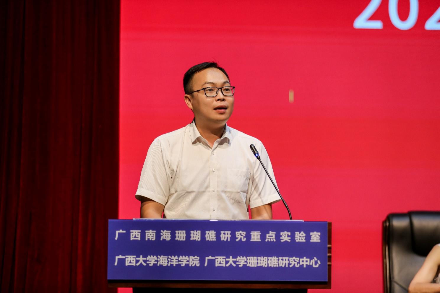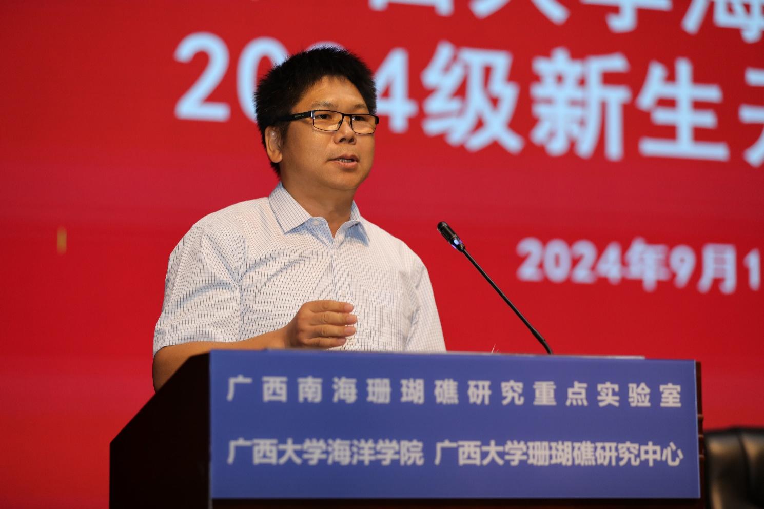余克服院长代表学院全体师生欢迎2024级同学的到来并作重要讲话。他全面向新生介绍了学院的情况。他指出,海洋是学校重点聚焦的四大办学特色之一,珊瑚礁是学校着力培育的四个特长之一;并且海洋科学是依托广西大学建设的广西唯一的世界一流学科“土木工程与先进材料学科群”最重要的支撑学科之一。2023年,学院的海洋科学人才培养模式获得了广西高等教育(本科)自治区级教学成果一等奖,学院的科学研究成果获得了广西自然科学一等奖等。以上成绩的取得不仅与学院全体师生所付出的辛勤努力密切相关,更重要的是体现了海洋的重要性。全世界为了生存或更好地生存,都把目光转向海洋。海洋既是生命的起源之地,也是传承人类未来发展的希望所在。但是,迄今人类对海洋的了解非常之少。海洋还有很多领域值得去探索和认知。自2012年党的十八大以来,我们国家提出了海洋强国的重要战略。海洋强国已经成为我们国家的基本国策。习近平总书记强调,我们要像对待生命一样关爱海洋。去年12月,习近平总书记视察广西时,进一步强调广西要解放思想,创新求变,向海图强,开放发展。目标非常清晰,蓝图非常宏伟,任务十分艰巨。需要我们关心海洋,认识海洋,经略海洋。这是每一位海洋人的责任,也是海洋学院的责任。学院的目标和任务就是围绕国家的海洋强国战略和广西的海洋强区战略,培养高水平的研究型海洋人才,服务国家和地方的重大需求。余院长进一步深入介绍了学院的珊瑚礁特色。学院是我国目前唯一一个以珊瑚礁为特色载体的海洋人才培养基地。学院在人才培养、科学研究和社会服务等方面都取得了丰硕的成绩。最后,余院长指出,学院作为广西唯一拥有“本-硕-博”一体化的海洋类人才培养基地,将竭尽全力地为同学们的成长和教育做好服务工作。希望学院的每位海洋人才在学院的精心培养下,健康快速地成长,勇担国家海洋强国重任。