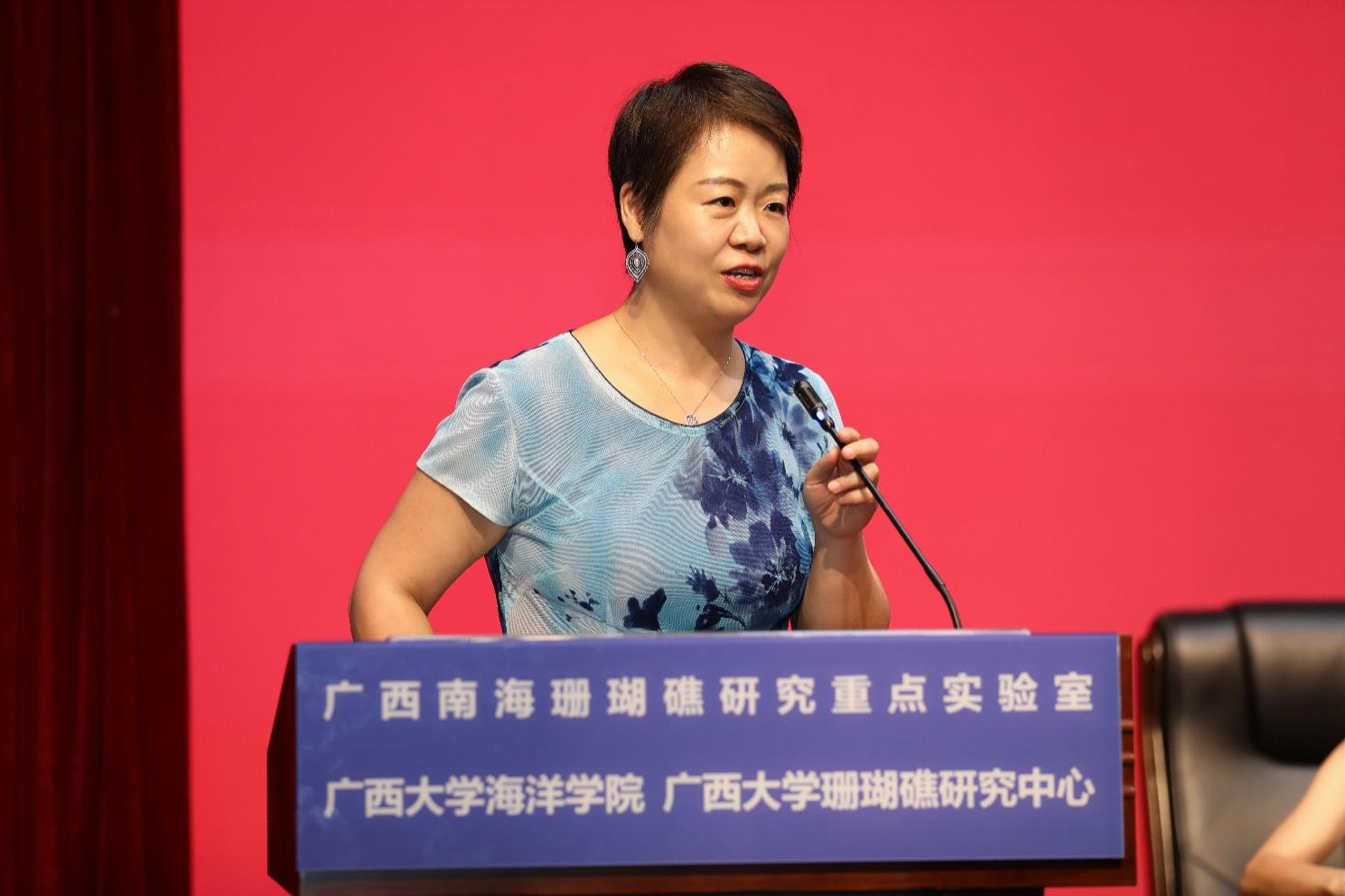 教师代表,入选中国科学院“引进海外杰出人才计划”(百人计划)、科瑞维安 2020 年和 2021 年交叉领域全球高被引科学家、2022 全球前 2%顶尖科学家、学院学术带头人、博士生导师徐向荣教授发言。她首先对新生表示热烈欢迎,并强调海洋的浩瀚与神秘,鼓励新生们肩负探索与守护海洋的重任。她向新生提出四点期望:心怀梦想,勇闯深蓝;勤奋耕耘,筑梦蔚蓝;携手同行,共创辉煌;心系国家,挺膺担当。目前的海洋充满着未知与挑战,拥有着无限的机遇和可能。她希望新生们以热爱为动力,以本领为基础,以内心为保障,以报国为使命,在海洋学院平台上探索无限可能。最后,她希望新生们在海洋学院的学习生活中取得丰硕成果。