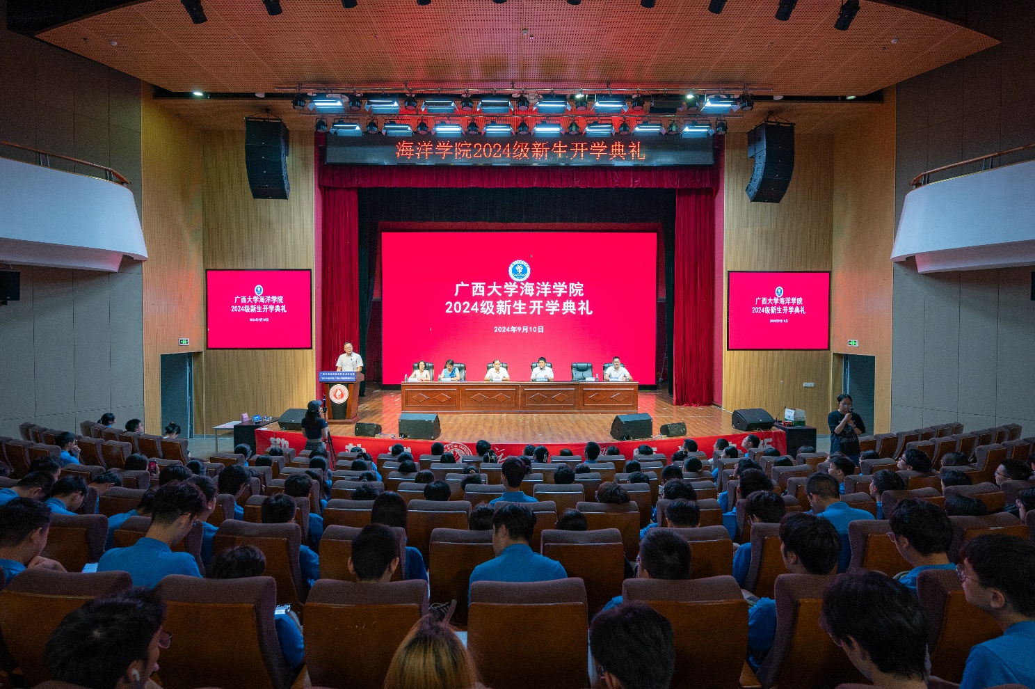 9月10日上午,广西大学海洋学院2024级新生开学典礼在大学生活动中心小礼堂隆重举行。78名本科学生、45名硕士研究生和5名博士研究生共128人参加了开学典礼。学院党委书记秦华东、院长余克服、党委副书记黄学勇、副院长刘旗扬、王瑞、院长助理黄荣永以及学院各教研室、职能部门负责人、新生班主任等老师出席开学典礼。党委副书记黄学勇主持典礼。