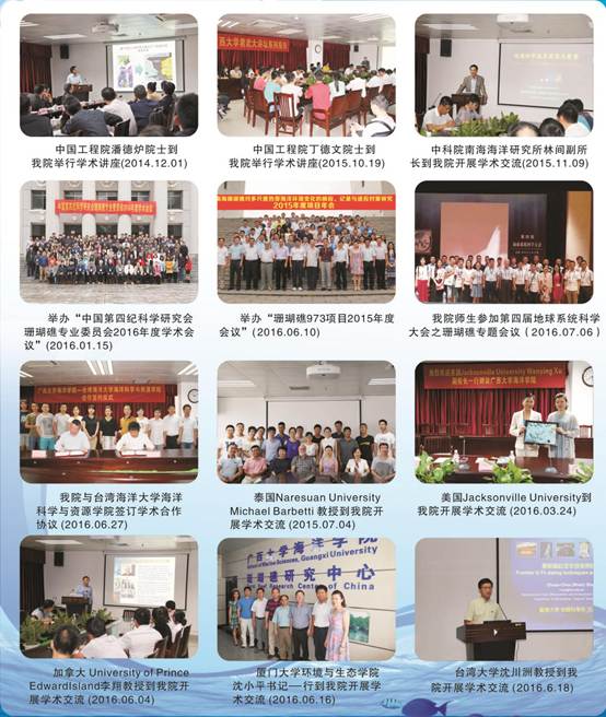 学院自成立以来多次组织开展大规模的综合科学考察活动。先后赴南海中沙、西沙和南沙群岛,以及海南三亚鹿回头、广东徐闻灯楼角、深圳大亚湾和广西涠洲岛、白龙尾等地进行科研项目调查活动,共计64人次、历时229天。采集了大量的关于南海珊瑚礁的地质、地貌、生态与环境等方面的关键数据和样本,为评估南海珊瑚礁的生态现状提供了第一手的素材,为南海珊瑚礁资源的保护、科学利用和岛礁开发积累了关键数据,为高质量完成国家重大科学研究项目奠定了基础。