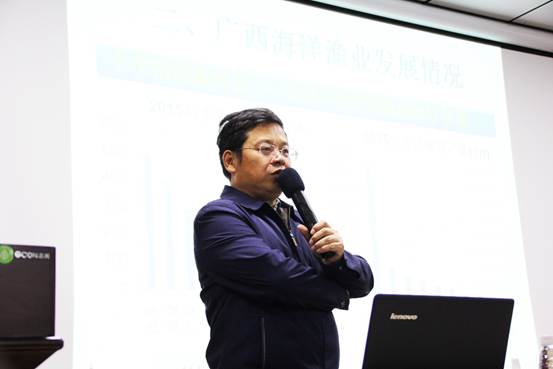 吴教授的讲座首先以钦州、防城港、北海三处广西区可与海相连通的出口为例,介绍了广西海洋气候、地质、水文等基本情况、广西代表性海洋生物的概况、以及海洋对广西综合发展的重要性。第二章的介绍中,他用大量的统计图表、科研数据、站在全国乃至世界的角度,讲述并对比了自治区海水养殖产量、海洋捕捞产量、水产品贸易情况等海洋渔业现状,并生动形象介绍了广西对虾、贝类、海水鱼、无公害水产品养殖、发展以及相关海产品文化建设等工作推进,让同学们垂涎三尺。