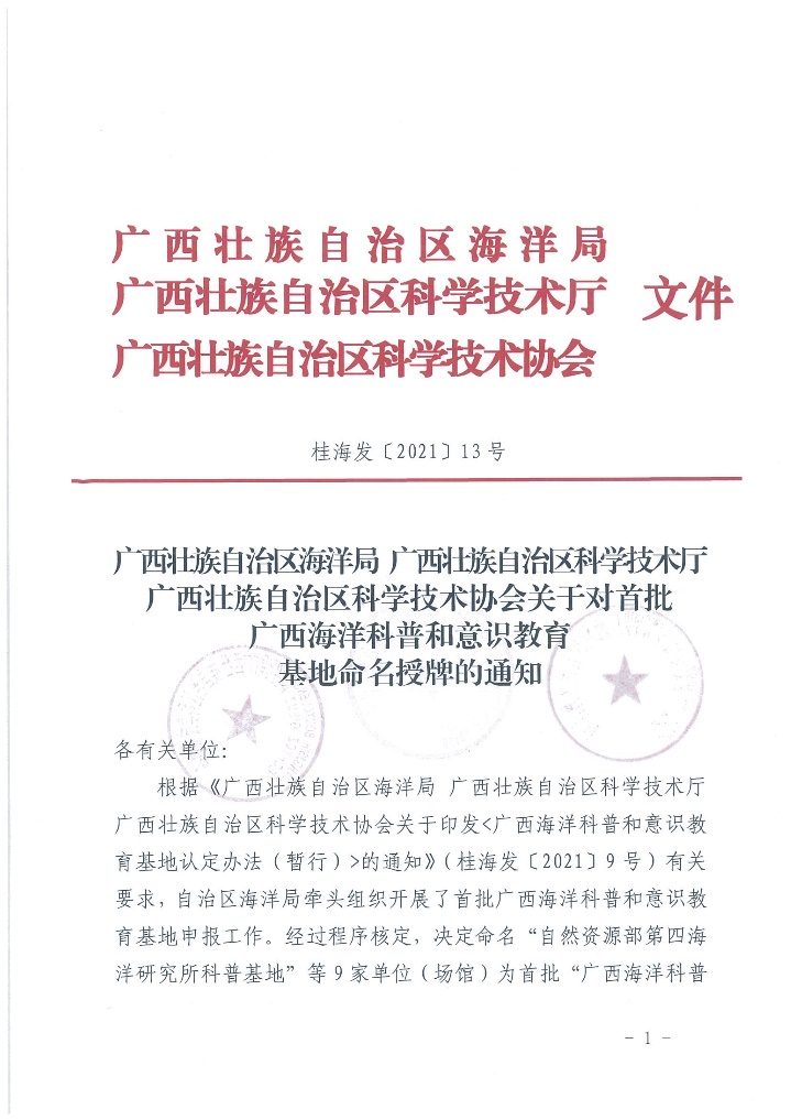 近日,自治区海洋局、自治区科学技术厅、自治区科学技术协会联合下发《关于对首批广西海洋科普和意识教育基地命名授牌的通知》,“广西大学涠洲岛珊瑚馆”位列其中。