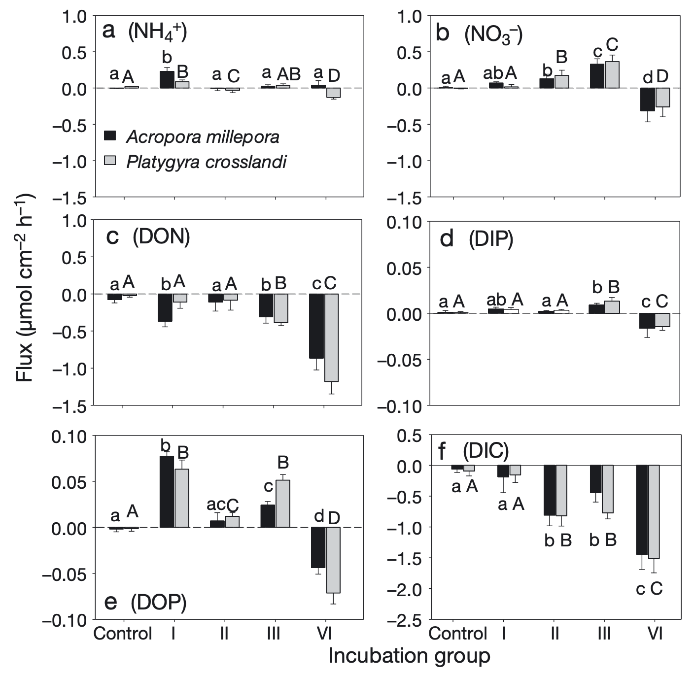 图2鹿角珊瑚(Acropora millepora)和扁脑珊瑚(Platygyra crosslandi)在5种不同营养条件下珊瑚共生体与海水之间的NH4+通量(a)、NO3−通量(b)、DON通量(c)、DIP通量(d)、DOP通量(e)以及DIC通量(f)。正值代表珊瑚对营养盐的吸收速率,负值代表珊瑚的营养盐释放速率。