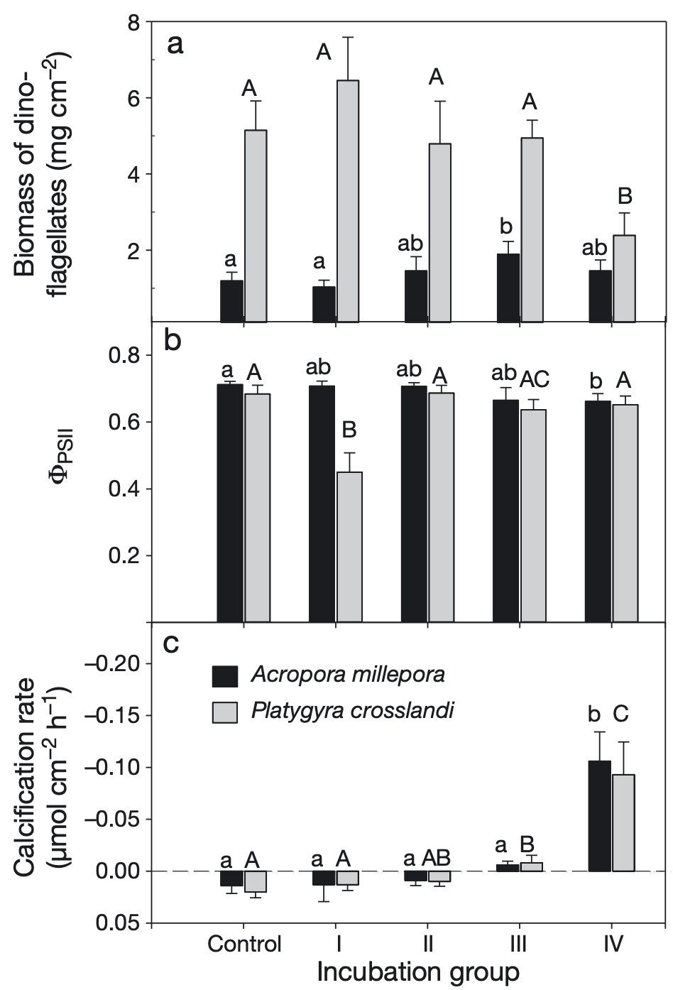 图1 鹿角珊瑚(Acropora millepora)和扁脑珊瑚(Platygyra crosslandi)在5种不同营养条件下的共生虫黄藻密度(a)、有效光合效率(ΦPSII)(b)和钙化率(c)。钙化率的负值代表碳酸钙的溶解速率