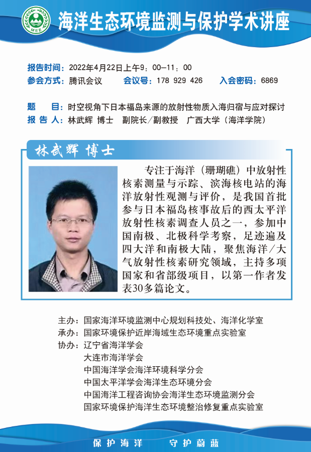 在世界地球日(4月22日上午)的特殊时刻,林武辉副院长应国家海洋环境监测中心邀请参加海洋生态环境监测与保护学术报告(线上报告),为国家海洋环境监测中心以及相关科研院所的近200名专家和学者带来题为《时空视角下日本福岛来源的放射性物质入海归宿与应用探讨》的学术讲座,国家环境保护近岸海域生态环境重点实验室副主任姚子伟研究员主持学术讲座,国家海洋环境监测中心政策规划与科技发展处孙钦帮处长出席会议。