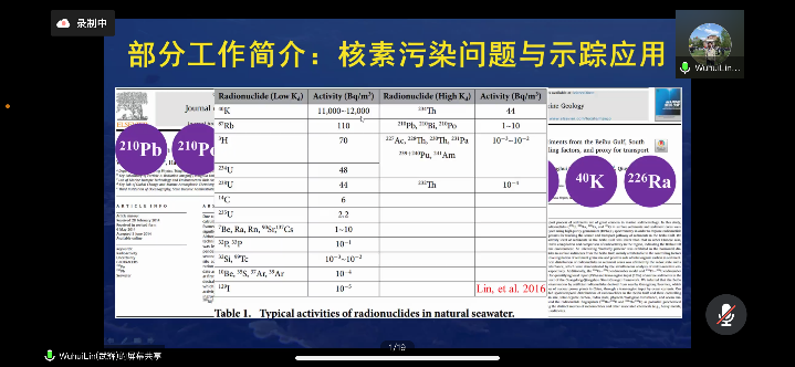 林武辉副院长是我国首批参加日本福岛核事故后西太平洋放射性调查人员之一,多年来专注于海洋放射性核素测量与海洋过程示踪、滨海核电站的海洋放射性观测与评价,主持海洋放射性核素研究领域的多项国家级和省部级项目,多次受邀参加国际原子能机构的相关会议,曾参加我国海洋环境放射性核素监测技术规程的编制工作,已经围绕海洋中210Po、210Pb、234Th、238U、226Ra、228Ra、228Th、232Th、40K、90Sr等多种天然和人工放射性核素开展较为系统的工作[1-5],并长期追踪日本福岛核事故和核污染水的前沿进展[6-8],目前也围绕南海珊瑚岛礁放射性核素研究开展相关探索工作[5,9-10]。(林武辉/文 会议截屏/图 周剑/编辑 余克服/审核)