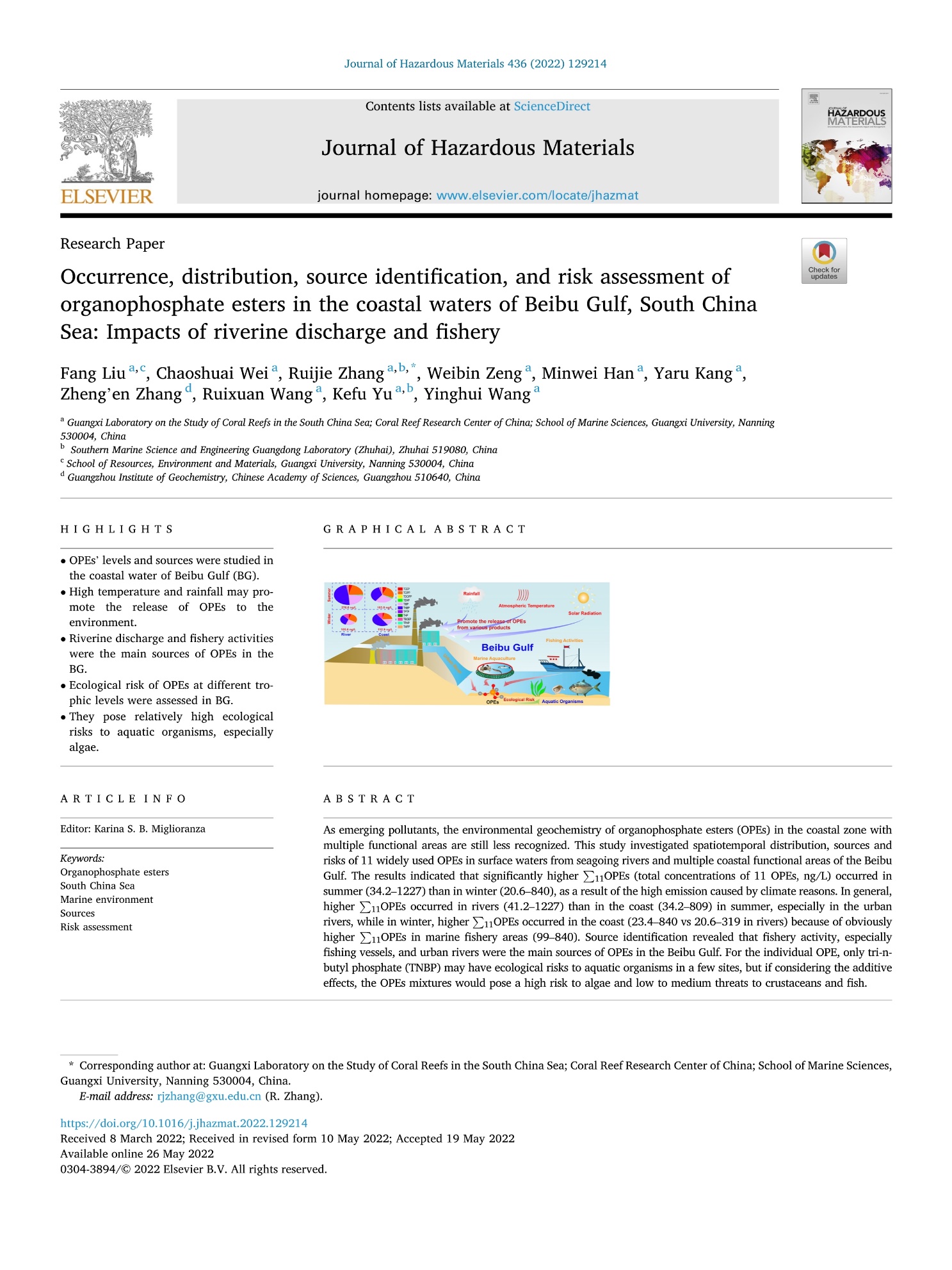近日,我院2020级硕士研究生刘方在张瑞杰副教授指导下,以第一作者在国际环境领域权威期刊Journal of Hazardous Materials (IF=10.588)发表论文“Occurrence, distribution, source identification, and risk assessment of organophosphate esters in the coastal waters of Beibu Gulf, South China Sea: impacts of riverine discharge and fishery”。