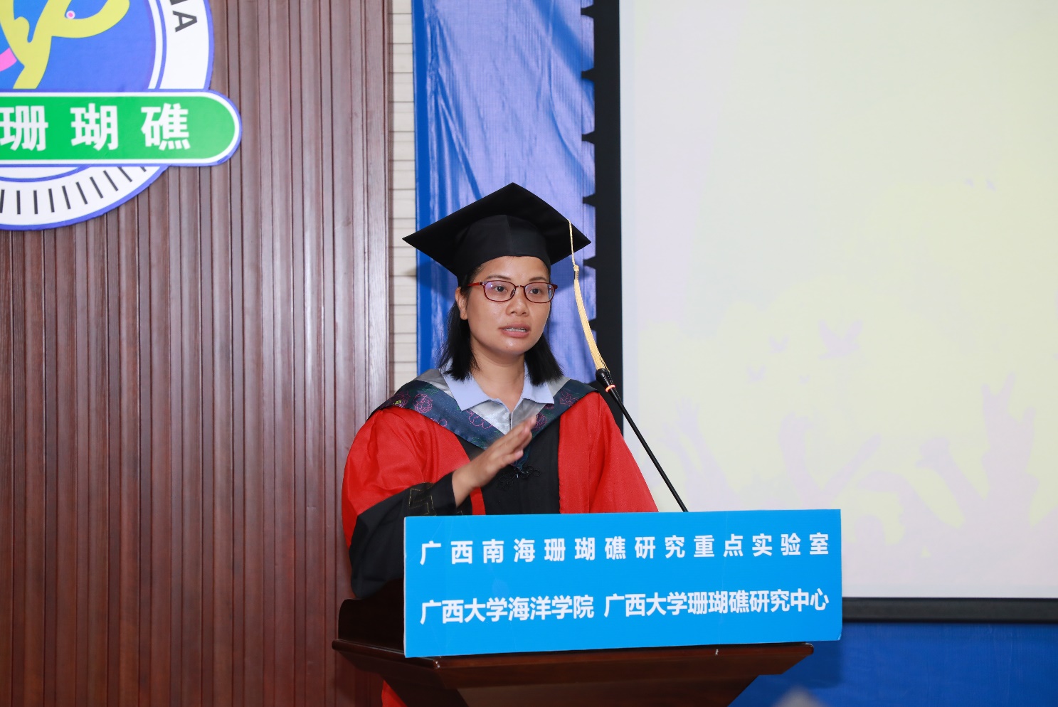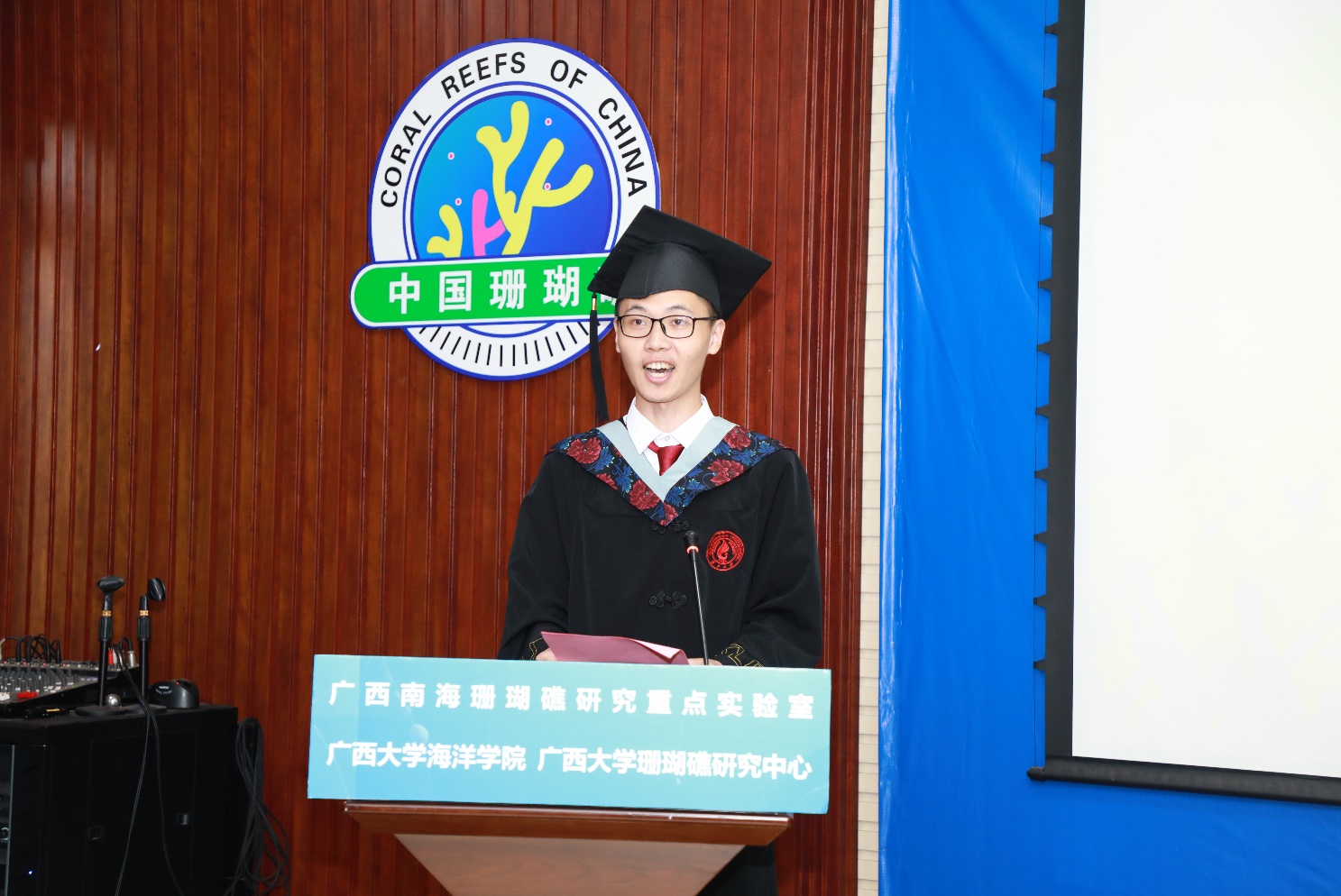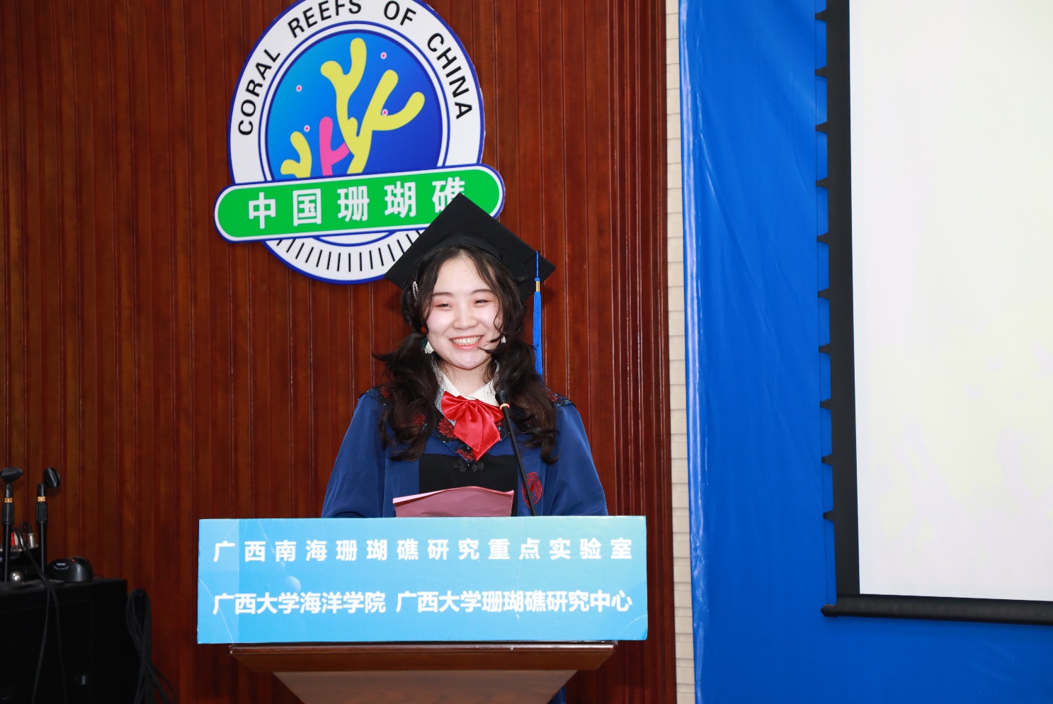海洋科学2018级本科毕业生代表、2022年自治区优秀毕业生获得者赵博义在发言中致敬了每一位平凡的海洋学院学生不平凡的求学时光:无论是老师们在第一堂课程有趣的开场白、引人入胜的专业课、亦或是团委学工老师暖心的一次次关怀,还是专业实习所带来的收获……即使是突发的新冠肺炎疫情都没能阻挡他们前进的脚步、对蓝色海洋的探索。2022届硕士毕业生代表、2022年广西大学优秀毕业生马一方回首了三年前遇到导师余克服教授,以此叩开了珊瑚礁学术研究的大门,不畏新冠肺炎疫情、克服研究条件受限等困难坚持开展实验,并成为珊瑚礁科学的研究者、科普者。教师代表、海洋科学2018级3班班主任韦芬老师分享了她对于本、硕、博三个阶段对“毕业”的不同感受,以此向同学们解读每个人生阶段对于“成长”的见解;回顾了她见证、陪伴同学们从青涩少年成长为栋梁之材的高校生活;最后对同学们提出了几点希望:保持终身学习的习惯、勇敢面对困难的勇气、保持年轻人的朝气和蓬勃。
