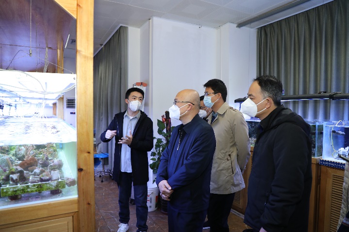 广西大学党办校办副主任、原海洋学院副院长王少鹏向调研组一行介绍了科普基地以珊瑚礁为主题和特色,向专业人士、社会观众、中小学生等开展珊瑚礁科普活动的情况。调研组实地考察了广西南海珊瑚礁研究重点实验室、珊瑚礁生态修复实验室、样品库、海洋科教馆等,了解了我院科研团队在涠洲岛开展珊瑚礁生态修复的工作进展;仔细察看了我院关于海洋科普和意识教育有关内容的宣传栏、展陈展品等各项科普设施设备。