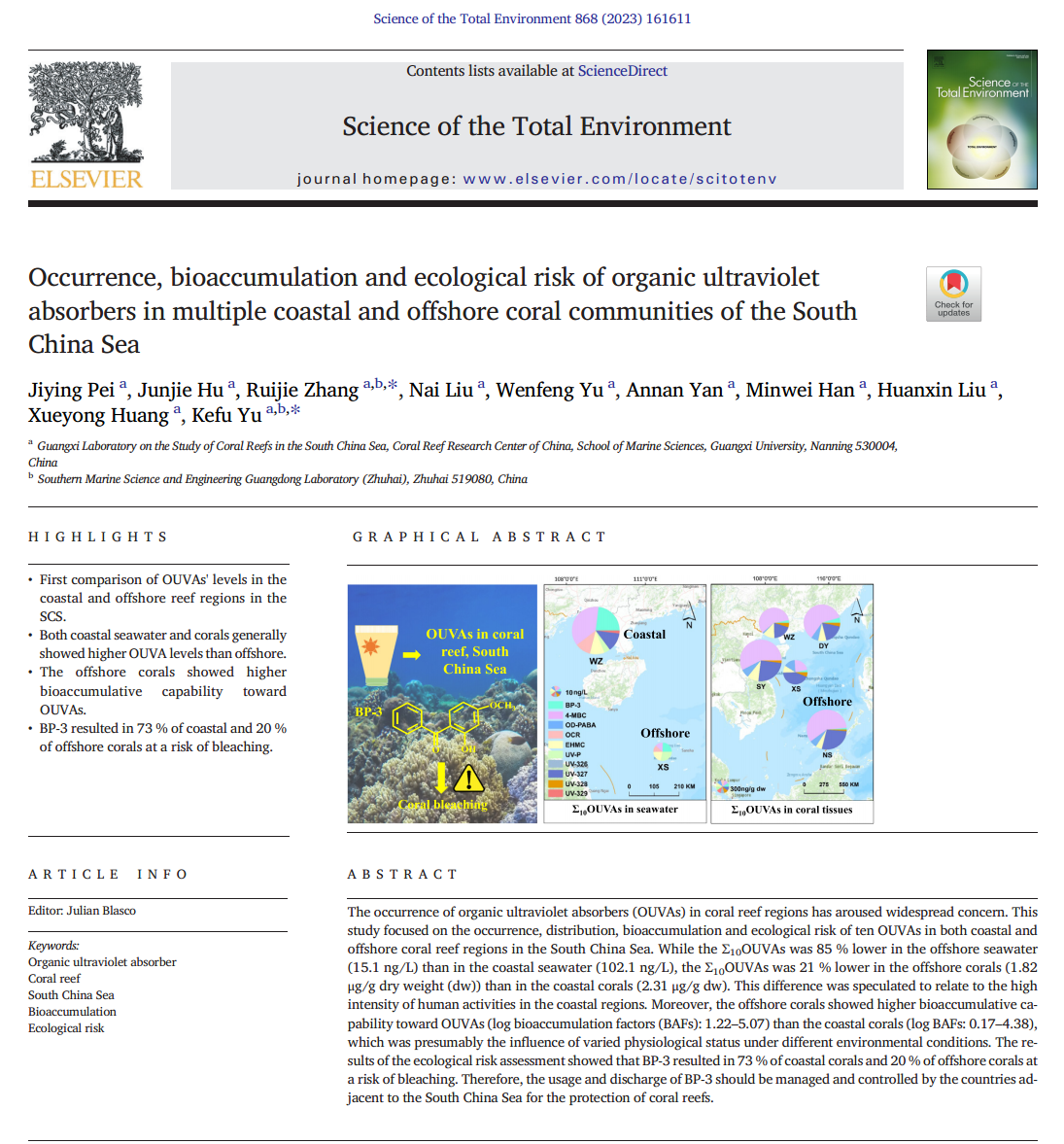 近日,我院环境与化学教研室裴继影老师为首、博士研究生胡俊杰为二作的研究论文“Occurrence, bioaccumulation and ecological risk of organic ultraviolet absorbers in multiple coastal and offshore coral communities of the South China Sea”在环境科学领域经典SCI刊物Science of the Total Environment(SCI一区,IF=10.75)上发表。该文通过南海近岸及远海珊瑚礁区中有机紫外吸收剂(OUVAs)含量的比较研究,首次系统阐述了有机紫外吸收剂(OUVAs)的污染特征及其对南海珊瑚造成的潜在威胁,重点分析了人类活动对南海OUVAs污染的影响,为南海珊瑚礁生态系统的保护与管理提供了新的参考依据。