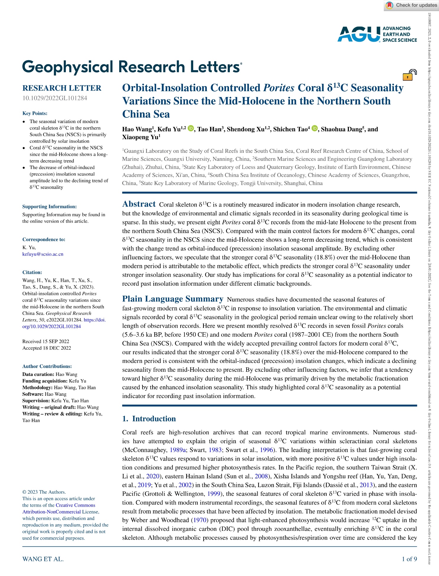 我院博士研究生王浩为第一作者的研究论文“Orbital-insolation controlled Porites coral δ13C seasonality variations since the mid-Holocene in the northern South China Sea”,在SCI一区Top刊物Geophysical Research Letters发表。该文揭示了珊瑚骨骼δ13C的季节性变化特征具有记录过去日照信息的潜力。