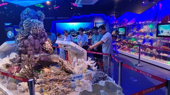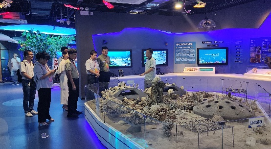 学院办公室主任李周佳老师向来访的各位代表介绍了海洋科教馆的基本情况,围绕着学院珊瑚礁研究的主线,从珊瑚礁的分布、功能,及我院关于珊瑚礁的研究、生态修复、服务南海岛礁建设等方面,向各位代表介绍了海洋科教馆的主要内容。同时,在珊瑚礁生态修复区域、深潜科考区域、服务国家南海岛礁建设区域,代表们还通过虚拟实境技术和互动装置、仿真模型等,体验了海洋科学家们开展科学研究的艰辛,感受到了海洋研究的激情。