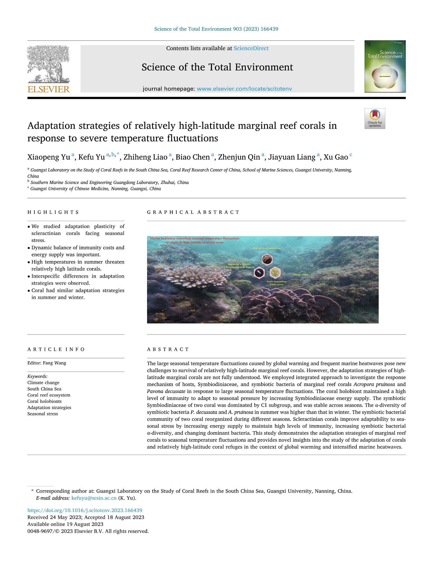Yu Xiaopeng, Yu Kefu, Liao Zhiheng, Chen Biao, Qin Zhenjun, Liang Jiayuan, Gao Xu. (2023). Adaptation strategies of relatively high-latitude marginal reef corals in response to severe temperature fluctuations, Science of The Total Environment, 903, 166439, https://doi.org/10.1016/j.scitotenv.2023.166439