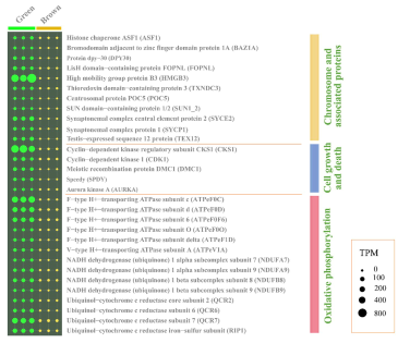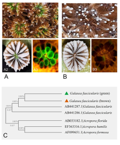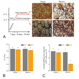2020年发表在《Current Biology》期刊上的一篇野外观察性研究论文揭示珊瑚颜色表型变化伴随珊瑚白化过程, 这种颜色表型的变化与珊瑚排藻白化过程中珊瑚对光的吸收有关, 是珊瑚适应环境胁迫的一种表现。为了进一步验证该理论, 研究团队在我国南海海域采集了同一种具有不同表型的丛生盔形珊瑚,并以其为研究对象分析了这2种不同表型的珊瑚对热胁迫的响应。 研究发现呈现绿色表型的珊瑚个体相对呈现棕色表型的珊瑚个体具有较高的热白化耐受性。进一步通过共生微生物组成和基因转录水平变化分析发现, 呈现绿色表型的珊瑚个体具有较高的绿色荧光蛋白、氧化磷酸化、细胞生长与死亡相关基因转录水平及较低的病原细菌丰度。