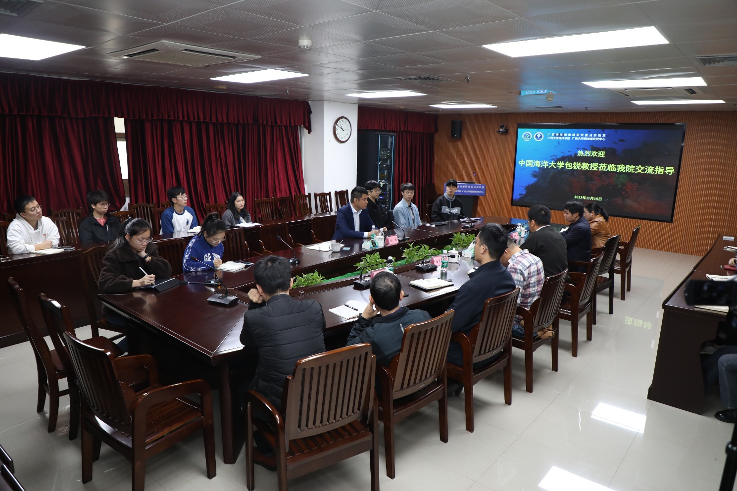 包锐教授还与我院师生进行座谈交流。余克服院长、广西南海珊瑚礁研究重点实验室常务副主任黄荣永相继介绍海洋学院、广西南海珊瑚礁研究重点实验室的综合建设情况。交流会中,海洋科学2021级硕士研究生高洁以“南海珊瑚礁区沉积物中有机碳的埋藏特征及对环境的指示意义”为题,从研究背景、拟解决的科学问题、目前初步结果等方面详细介绍了珊瑚礁沉积有机碳在碳循环中的重要作用。包锐教授结合他自己的求学和科研相关经历,为同学们分享了如何讲好科研故事、增加国际视野等宝贵经验。
