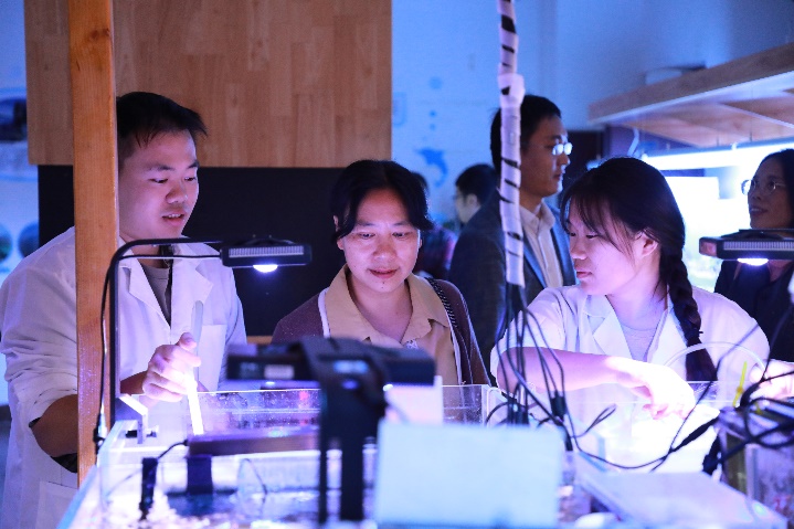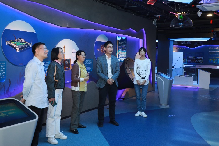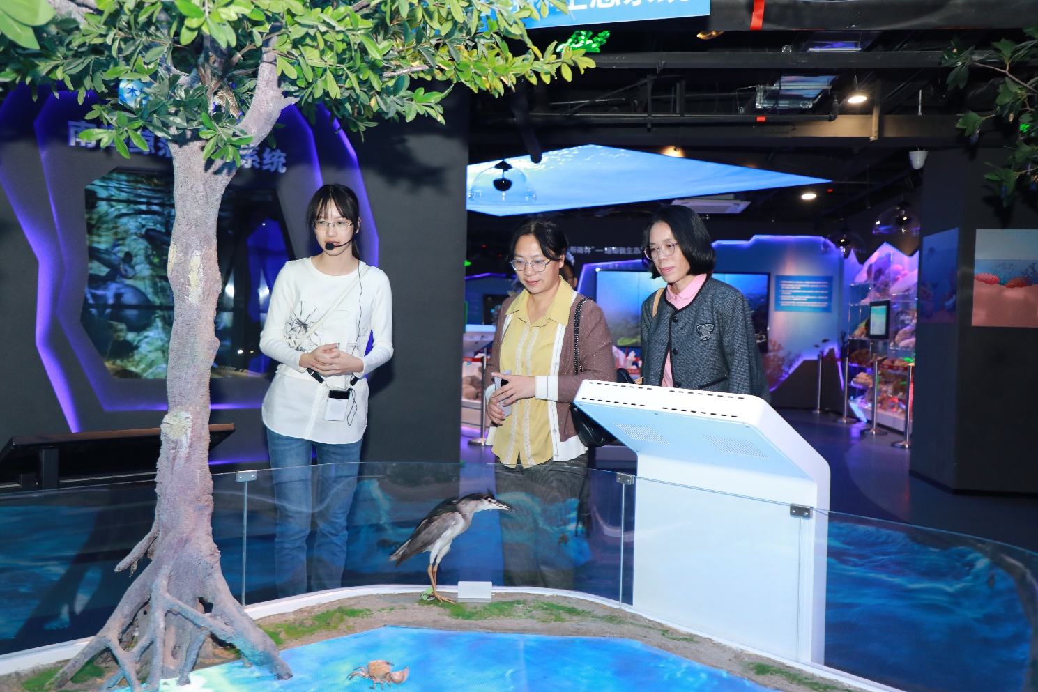 福建农林大学海洋学院副院长黄小红教授(中)考察广西大学海洋科教馆