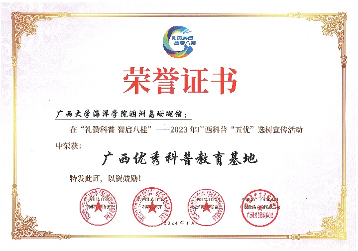 1月17日,在广西科技馆举行的“礼赞科普 智启八桂——2023年广西科普‘五优’选树宣传活动”颁奖典礼中,海洋学院涠洲岛珊瑚馆入选“十佳优秀科普教育基地”。组委会授予海洋学院涠洲岛珊瑚馆礼赞词:带着赤诚之心,奔赴“珊海”。作为全国最大的珊瑚馆,也是全国首个以珊瑚礁为主题的科研科普场馆,在浩瀚海洋里“种”珊瑚,为珊瑚礁科研与科普服务“向海图强”提供了更为浩瀚的实践平台。