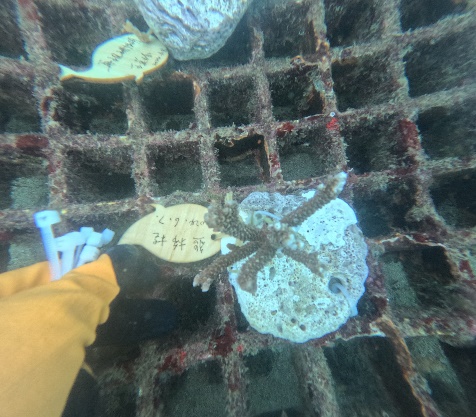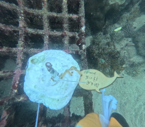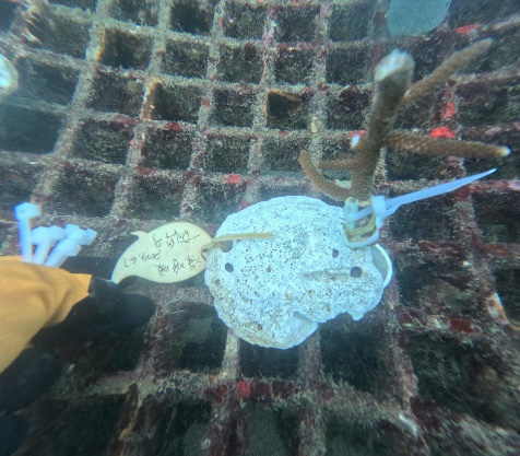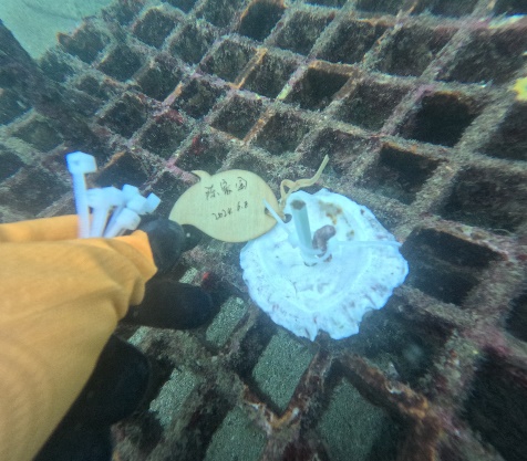 在活动现场,广西大学海洋学院涠洲岛珊瑚馆李雨箫邀请嘉宾们共同加入到涠洲岛珊瑚保护计划。保护计划采用“珊瑚认养”方式,依托海洋学院在涠洲岛海域成功的珊瑚礁修复和培育技术,发动社会力量一起开展珊瑚保育工作,做到全民科普、全民保护、全民参与。李雨箫带领现场的领导和嘉宾亲自将珊瑚宝宝固定在苗托上,给珊瑚宝宝命名。随后,广西大学海洋学院涠洲岛珊瑚馆馆长黄雯博士带领专业潜水员投放到海洋学院位于涠洲岛海域的修复区中。通过珊瑚认养活动,让参与者亲身体验珊瑚保护的重要性,增强对海洋生态环境保护的认识和责任感,促进公众参与珊瑚保护工作,推动珊瑚礁生态保护事业的发展。