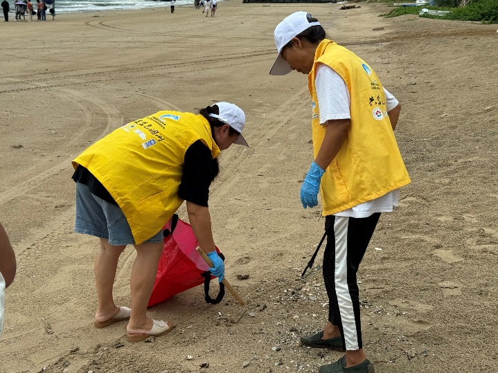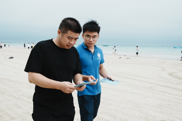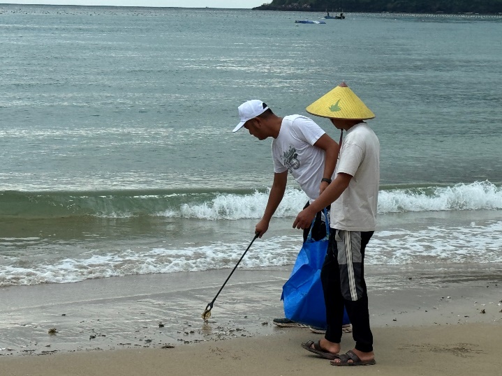开幕式结束后,在涠洲岛南湾海上运动基地举行了“净滩行动”,二十多名志愿者带上清洁工具,沿着海边分组收集并分类海滩上的废弃垃圾。他们向岛上的游客、居民和商家科普“可持续旅行”这一新理念,呼吁大家改善不良习惯,提升涠洲岛“最美海岛”的环境品质,鼓励全民行动起来保护涠洲岛的海洋生态环境。