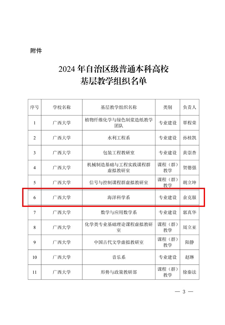 近日,广西壮族自治区教育厅印发了《关于公布2024年自治区级普通本科高校基层教学组织名单的通知》(桂教办〔2024〕941号),我院余克服教授负责的海洋科学系基层教学组织成功获批。