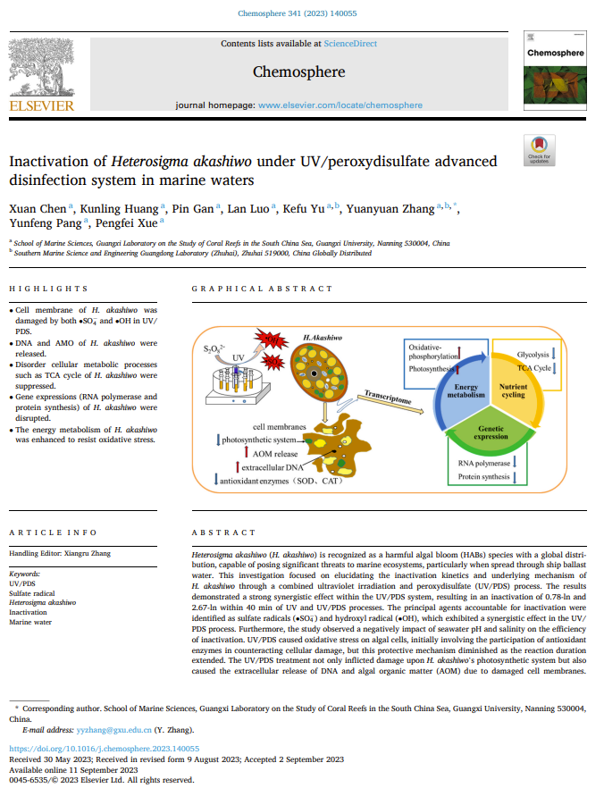 研究发现,UV/PDS显著提高了赤潮异弯藻灭活效率,其中•SO4其灭活的贡献约为51.45%转录组分析揭示了UV/PDS处理后,赤潮异弯藻细胞与能量代谢、碳水化合物代谢和蛋白质合成相关的差异基因。细胞增强光合作用和氧化磷酸化以获得额外的能量,而糖酵解、TCA循环和戊糖磷酸代谢等营养代谢过程受到抑制。核糖体和RNA聚合酶基因表达显著下调,组织蛋白水解酶基因表达上调,表明蛋白质合成受到抑制,蛋白质损伤加剧。目前相关成果被收录在中国科学院2区期刊:Chemosphere. (IF = 8.1)