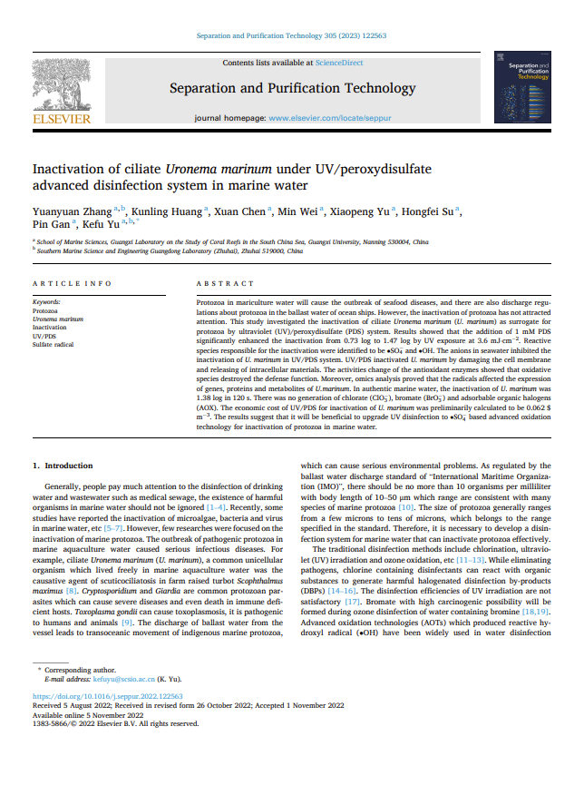 结果表明,UV/PDS系统对海洋尾丝虫具有极强的灭活效果,系统中产生的自由基破坏了海洋尾丝虫细胞完整性和酶活性,且影响了基因、蛋白质的表达以及代谢产物。研究还发现,添加碳源会抑制ClO3BrO3无机消毒副产物的产生。该技术为绿色高效海水养殖水体消毒技术的发展提供了新的思路。目前相关成果被收录在中国科学院1区期刊:Separation and Purification Technology. (IF = 8.1)