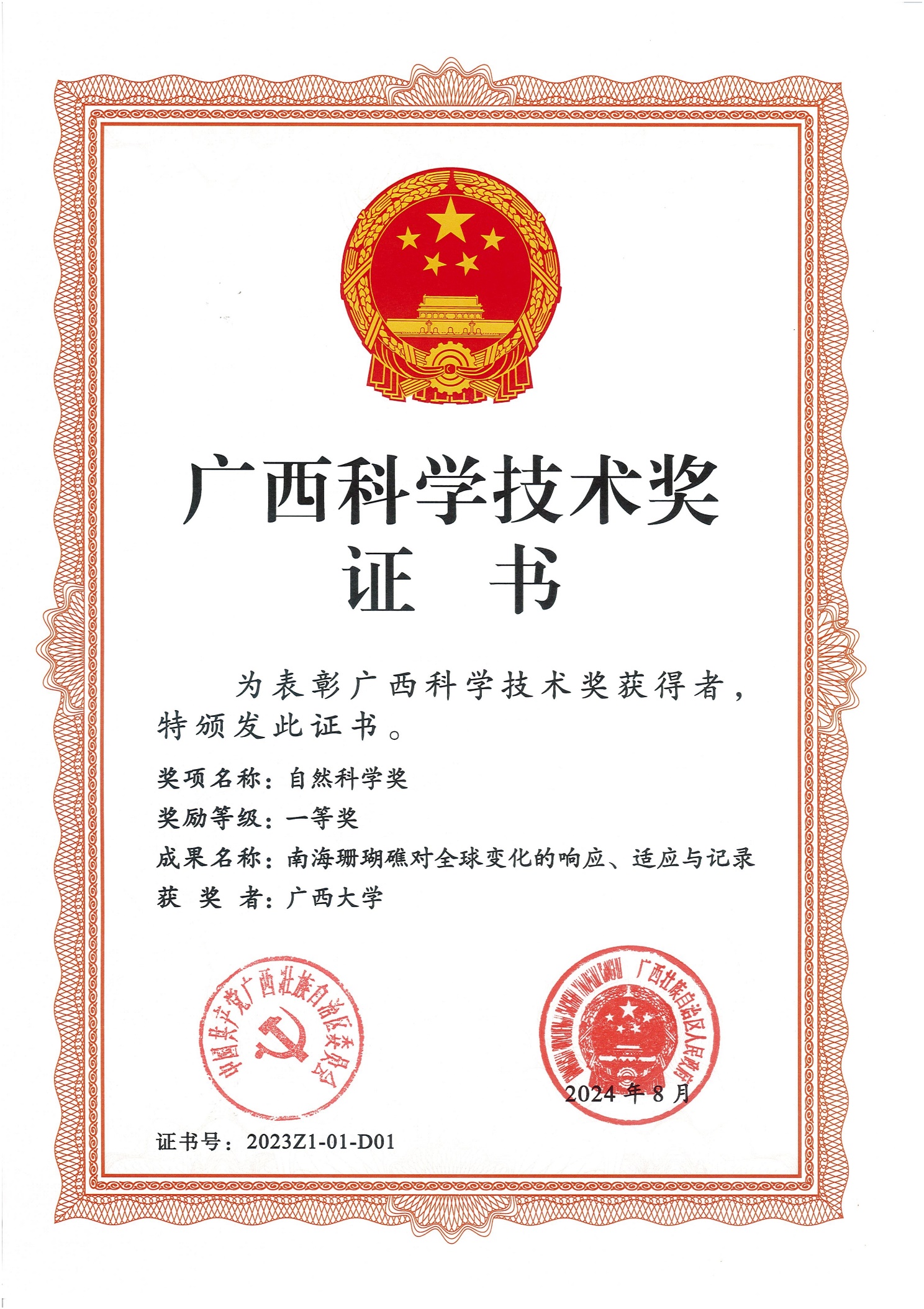 我院珊瑚礁研究成果荣获2023年度广西自然科学一等奖
