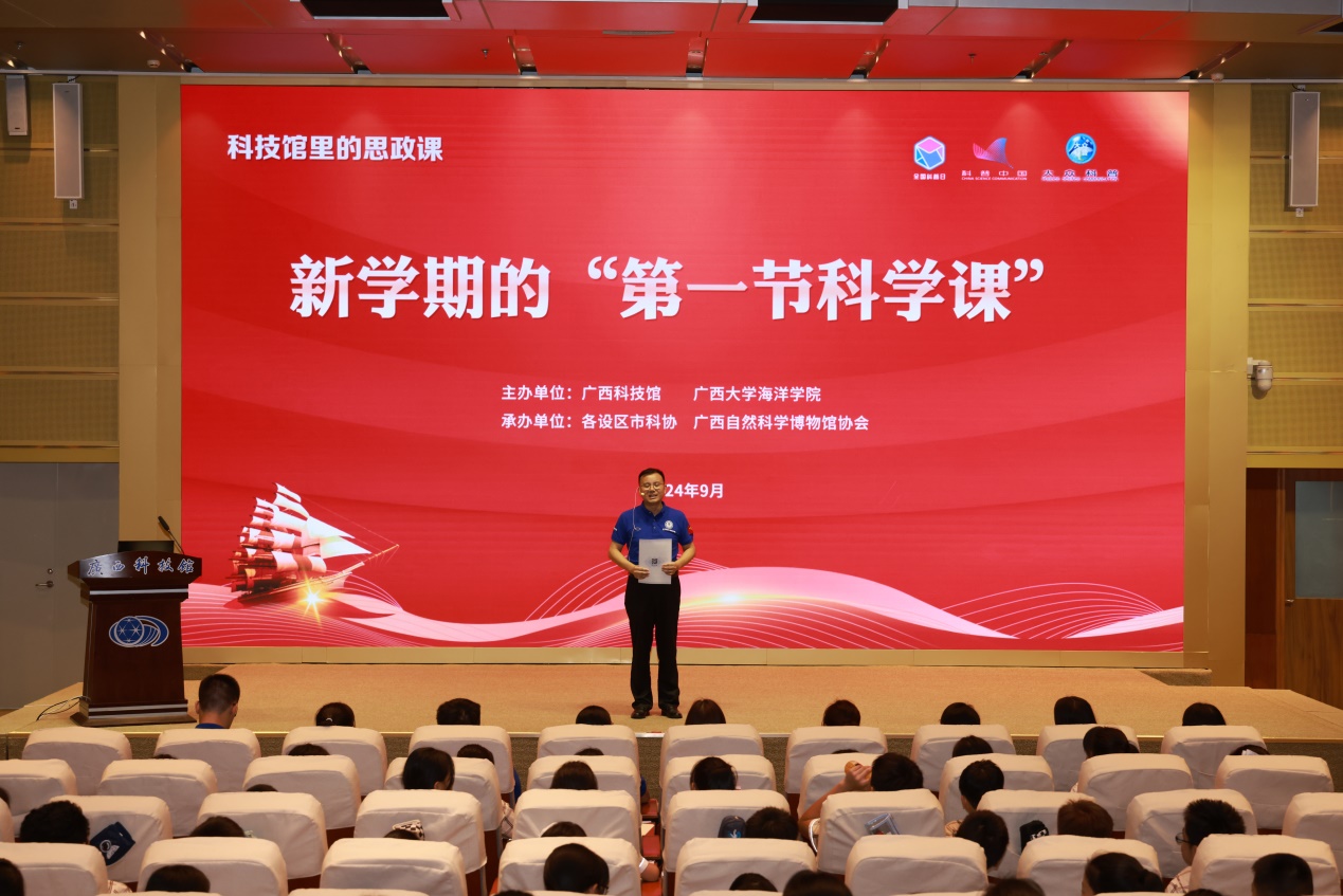 9月11日下午,由广西大学海洋学院“蓝色梦想”科考队成员主讲的“科技馆里的思政课:新学期的第一节科学课”在广西科技馆学术报告厅开讲。该活动作为2024年全国科普日广西活动暨八桂科普大行动系列活动之一,是由广西科技馆、广西大学海洋学院联合开展,全区约12.05万名中小学生以线上线下相结合的方式参加。