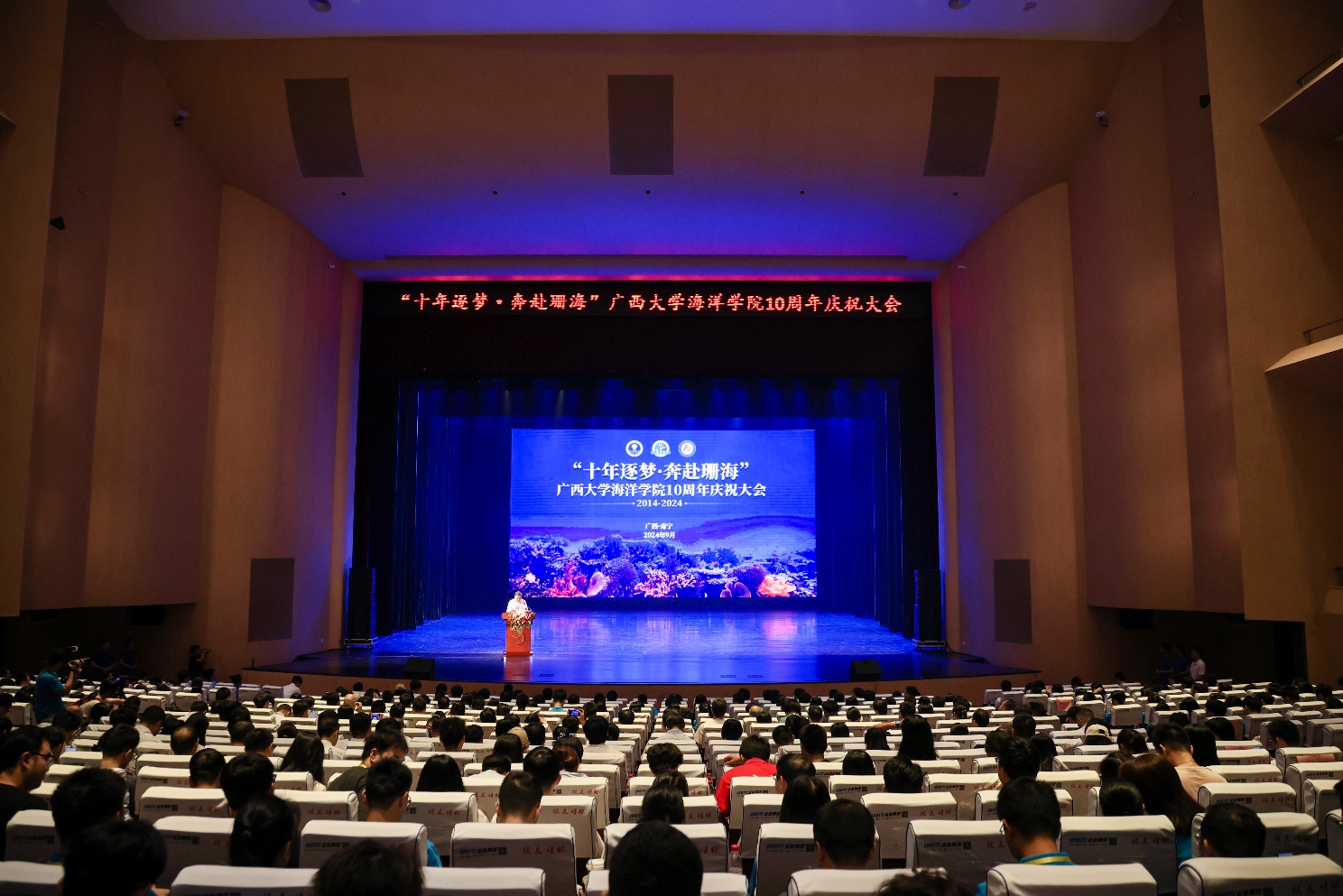 十载使命行而不辍,十年初心历久弥坚。9月21日,“十年逐梦· 奔赴珊海”广西大学海洋学院成立10周年庆祝大会在汇学堂隆重举行。自然资源部第四海洋研究所副所长兼总工程师徐兴永,桂林理工大学党委副书记吴志强,广西开放大学副校长黄鹄,广西科学院原副院长陈波,广西大学党委常委、副校长宁旭初、肖建庄、梁恩维等领导嘉宾莅临庆祝大会。海洋学院领导、教师、各地校友、师生代表,来自企事业和关心学院发展的各界嘉宾,以及广西大学各职能部门、各学院领导500余人共襄盛会。