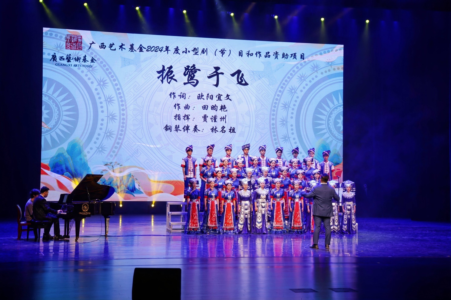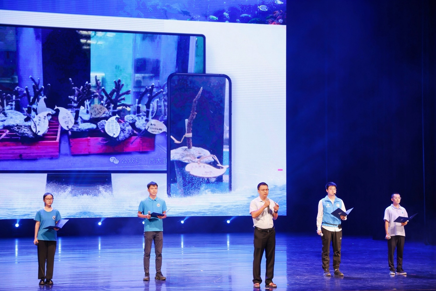 尾声部分,广西大学海洋学院院歌《逐梦珊海》由艺术学院副院长欧阳宜文作词、艺术学院田昀艳副教授作曲,艺术学院青年教师田昀艳副教授与海洋学院青年教师周剑、李周佳带领两院师生共同完成,表达了全院师生对海洋学院未来发展的美好祝愿。