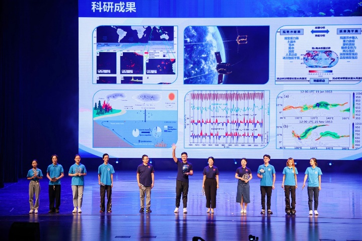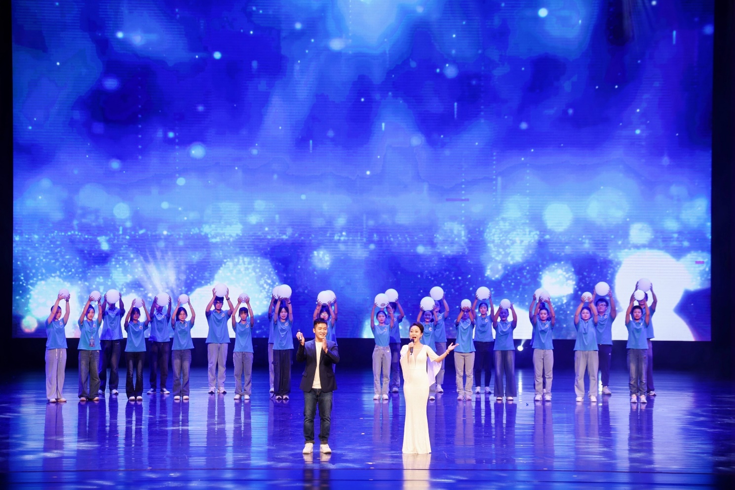歌伴舞《光》由艺术学院青年教师田昀艳副教授、海洋学院青年教师周剑带领两院的同学们共同演绎。节目展示了学习海洋知识如同一场追逐光明的旅程,学子们在知识的海洋中勇敢探索、不断前行,追逐那一束束照亮未来的希望之光。
