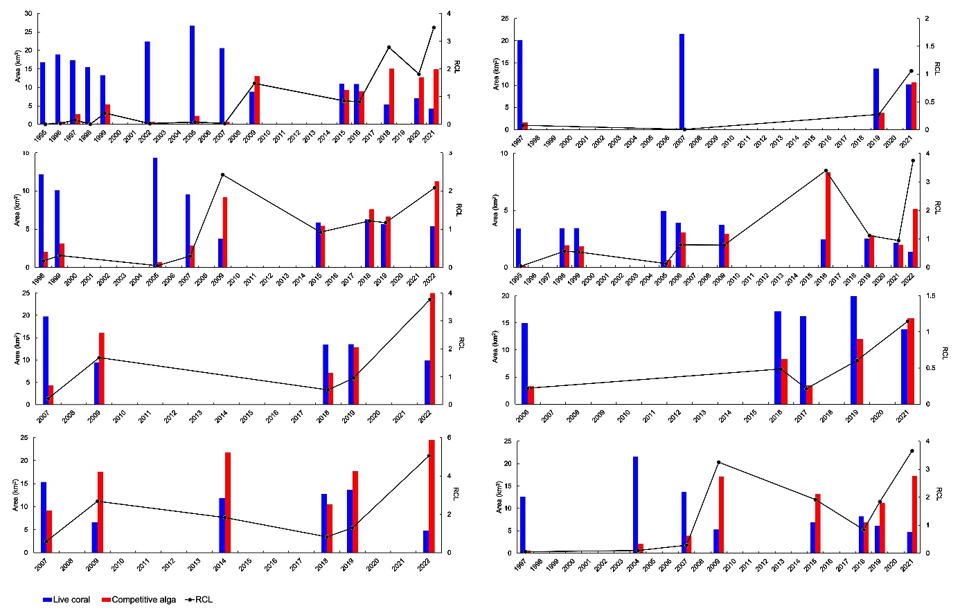 图3 南海典型珊瑚礁活珊瑚与竞争性藻类生长分布区特征时间序列,包括活珊瑚生长区面积、竞争性藻类生长区面积及其面积比(RCL):北礁、七连屿、盘石屿、永兴岛、华光礁、黄岩岛、浪花礁和玉琢礁