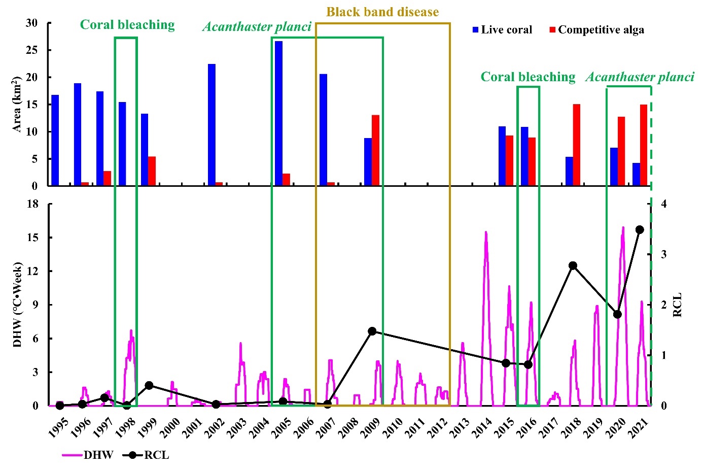 图4 南海珊瑚礁典型生态事件(珊瑚白化、长棘海星爆发和黑带病爆发)、周热度(DHW)压力和竞争性藻类生长分布区面积、活珊瑚生长分布区面积及其比值(RCL)之间的对应(以北礁为例)