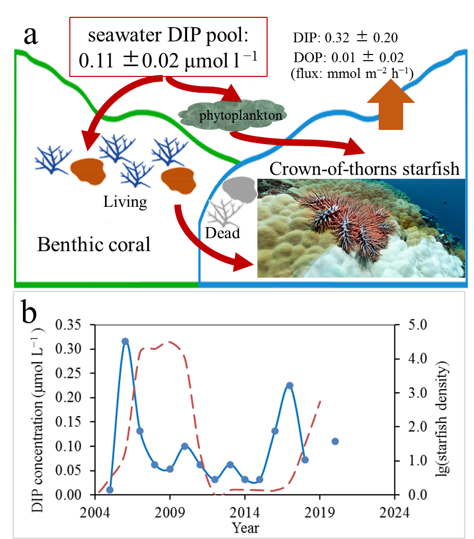 图1 长棘海星参与的珊瑚礁区磷元素循环(a)及海水溶解无机磷浓度和长棘海星密度的年际变化(b)