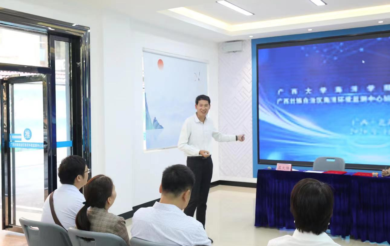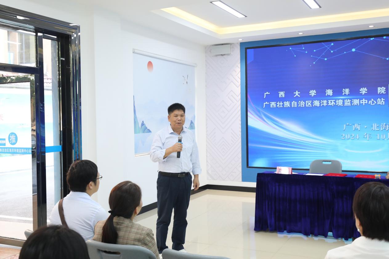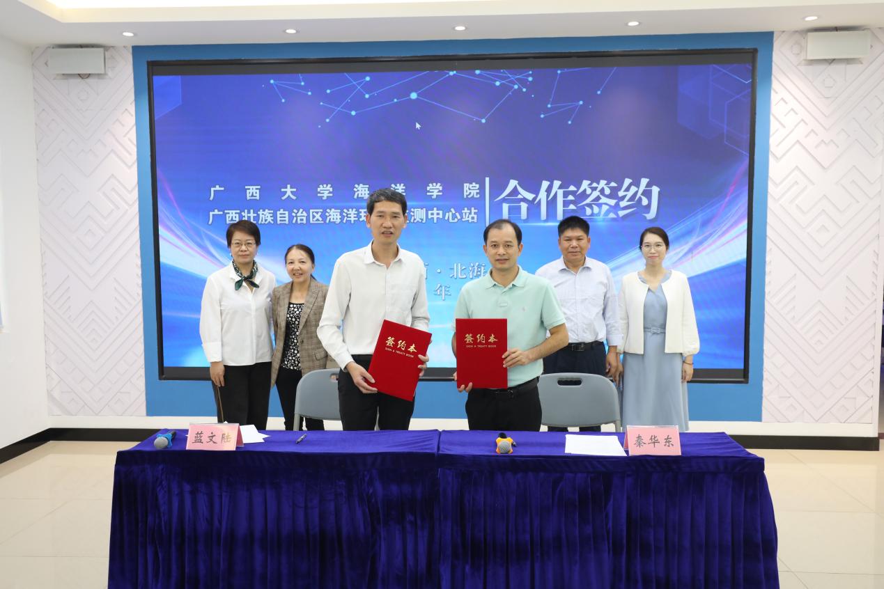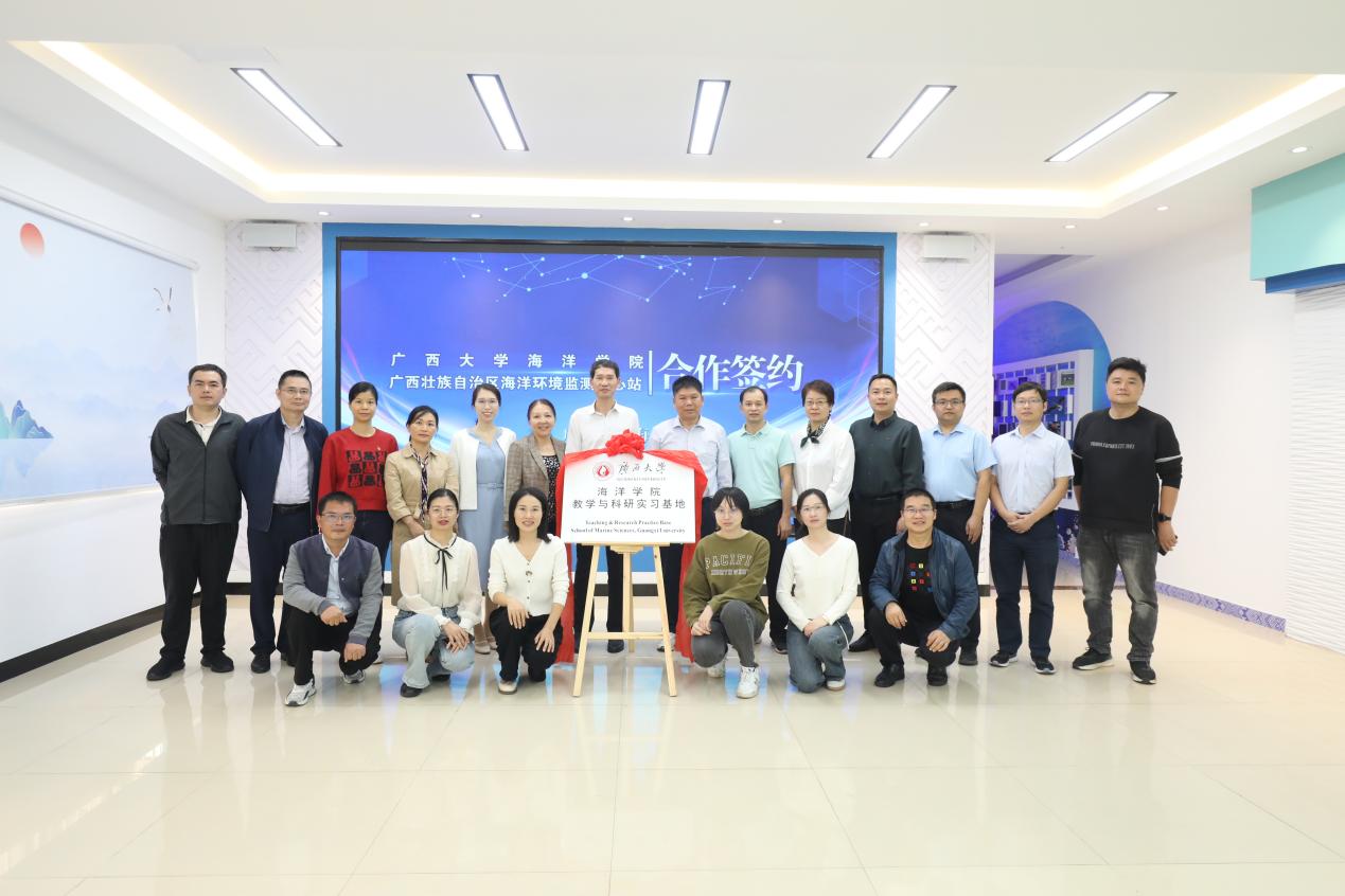 2024116广西大学海洋学院与广西壮族自治区海洋环境监测中心站(简称“中心站”)在北海隆重举行合作签约揭牌活动。学院党委书记秦华东、院长余克服,中心站蓝文陆站长、覃秋荣总工程师及双方业务职能部门骨干代表出席活动。