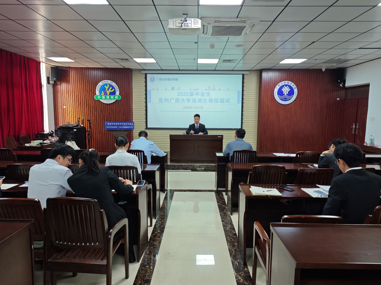 12月5日上午,学院2025届毕业生定向广西大学选调生模拟面试于海洋学院215教室举行,谭运阳,黄学勇、辅导员梁琪老师担任现场评审。
