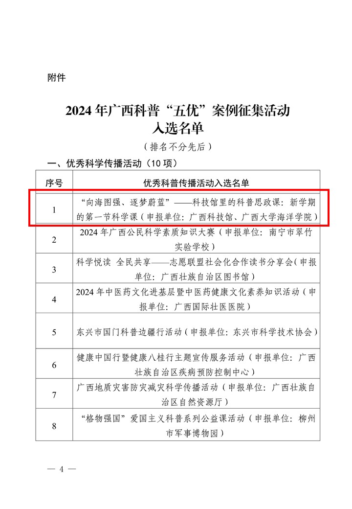 1月16日,自治区科协、自治区科技厅、自治区社科联、共青团广西区委公布“礼赞科普 智启八桂”——2024 年广西科普“五优”案例征集活动入选名单,我院组织开展的科普活动“‘向海图强、逐梦蔚蓝’——科技馆里的科普思政课:新学期的第一节科学课”入选2024 年广西科普“五优”案例——优秀科学传播活动。