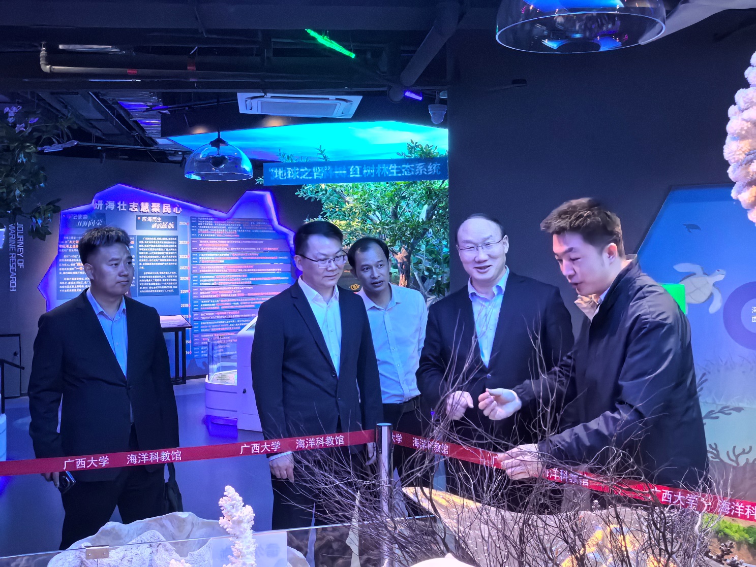 在海洋科教馆,张院士一行听取了我院院长助理俞小鹏关于我院在海洋资源开发、生态保护、深海探测技术等方面的科研成果汇报,实地察看了海洋生态模拟系统、深海探测装备模型、海洋生物多样性标本等核心展区,详细了解广西大学在珊瑚礁生态修复、深海传感器研发等领域的技术突破。张锁江详细询问了技术转化流程,对团队将化学工程原理与海洋生物学结合的创新路径表示高度赞赏。