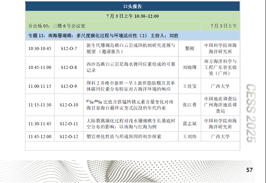 “南海珊瑚礁”专题口头报告日程